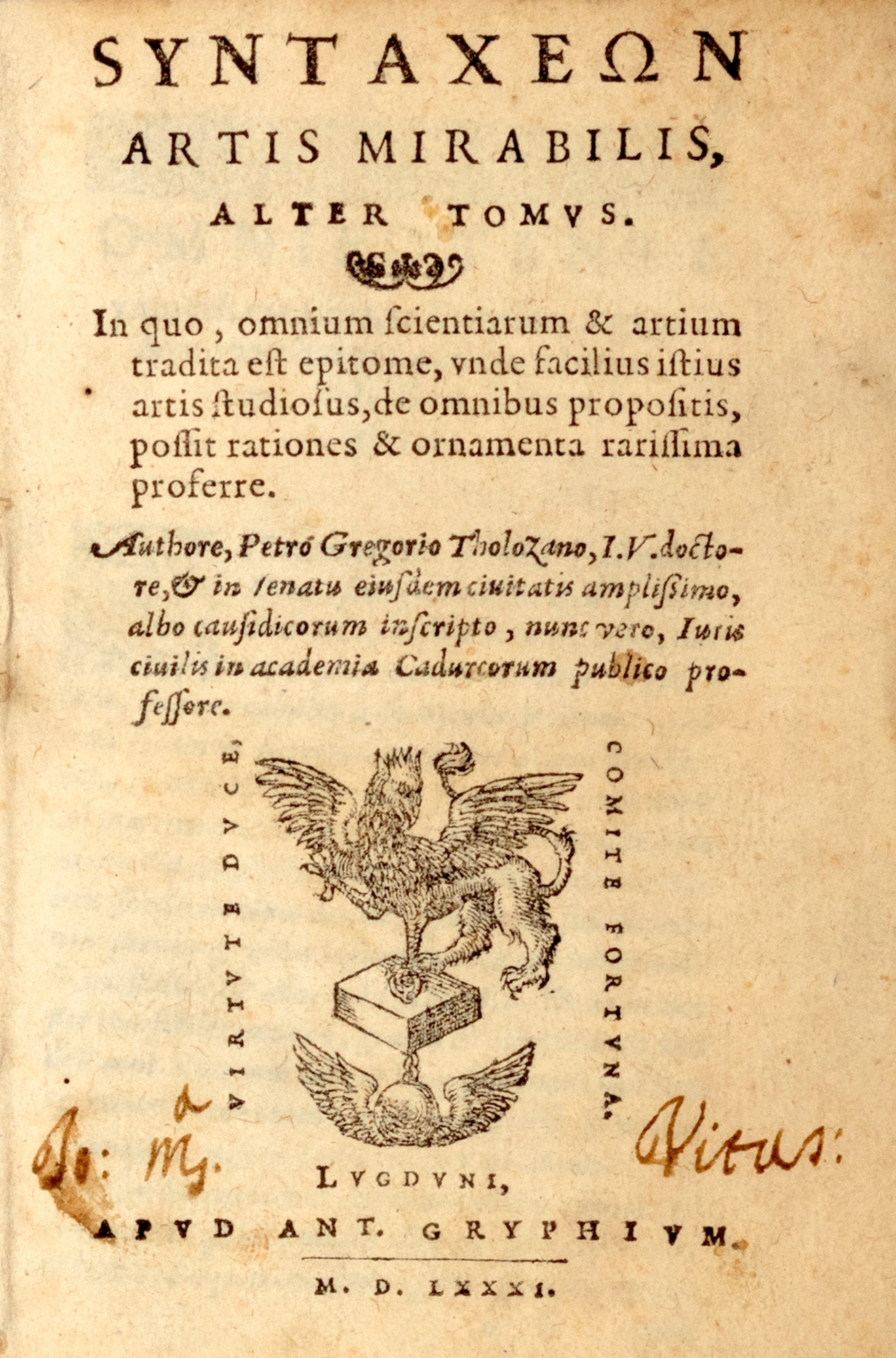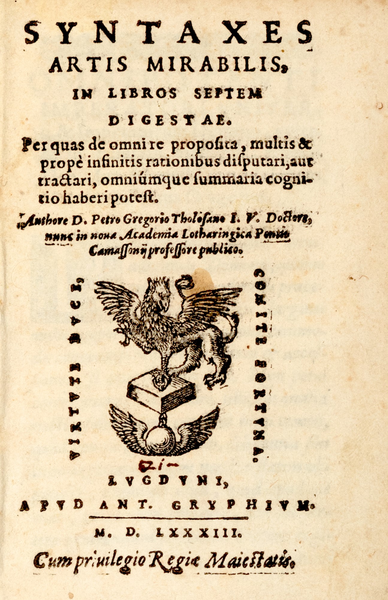 Due belle edizioni lionesi del Syntaxes artis mirabilis, (1578). Una sorta di enciclopedia del sapere scientifico in cui il giurista, filosofo ed enciclopedista francese Pierre Gregoire (1540-1597) intreccia scienze e matematica con demonologia, magia e astrologia. Il libro fu presto messo all'indice. L'opera riscosse notevole successo.