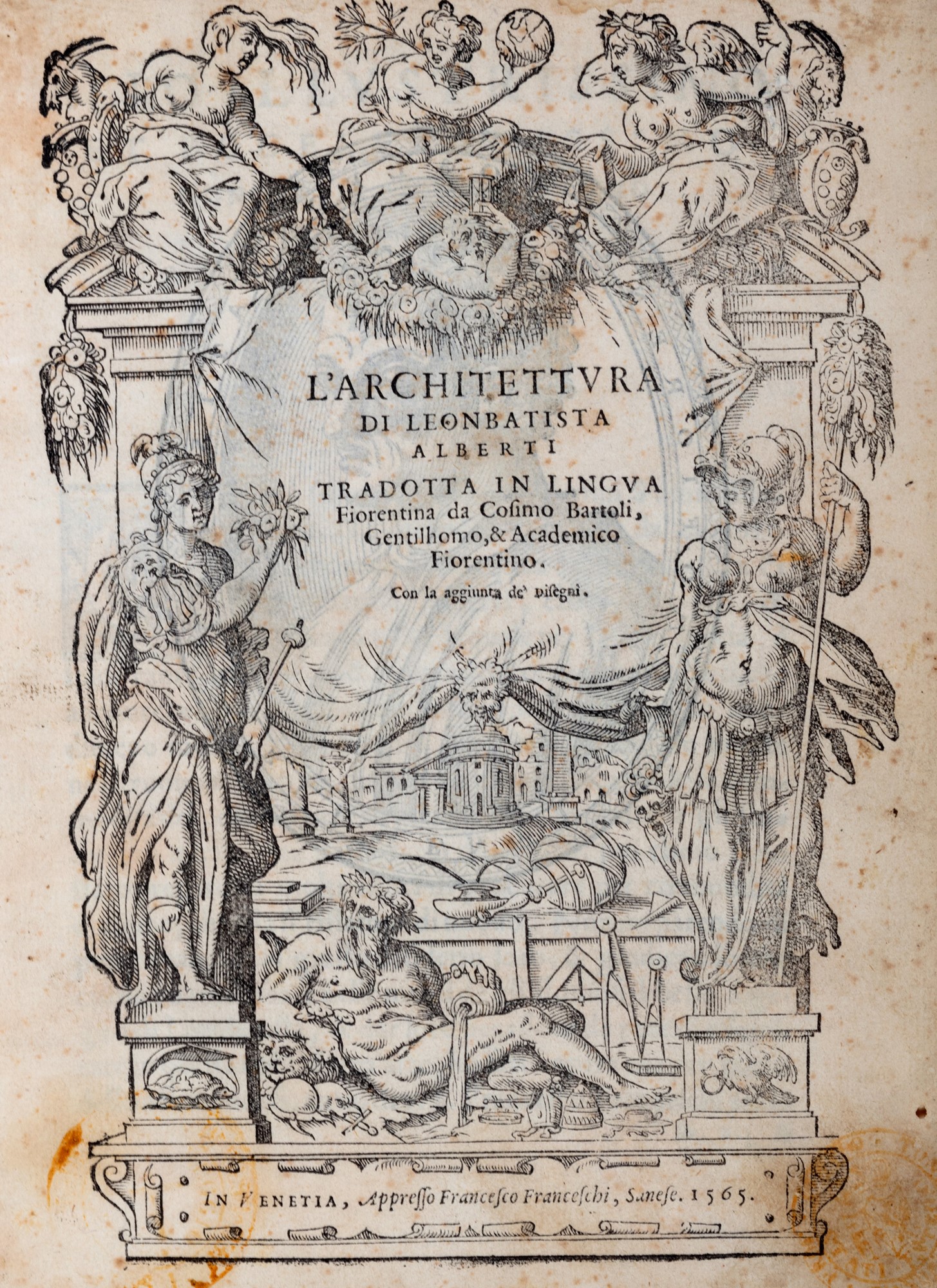 Seconda edizione con traduzione italiana del trattato di architettura di Alberti noto come De re aedificatoria. La prima edizione uscita nel 1550 per i tipi di Torrentini. Partendo dai temi e dai modelli vitruviani, Alberti fonda con quest'opera il genere moderno del trattato di architettura. La traduzione in "lingua fiorentina" del Bartoli rende l'opera ancora più interessante anche da un punto di vista linguistico poichè il traduttore, ignorando spesso il lessico originale dell'autore, reinterpreta il testo utilizzando molti termini presi in prestito dal mondo artigianale della Firenze del XVI sec. Esemplare con elementi della variante B e C.