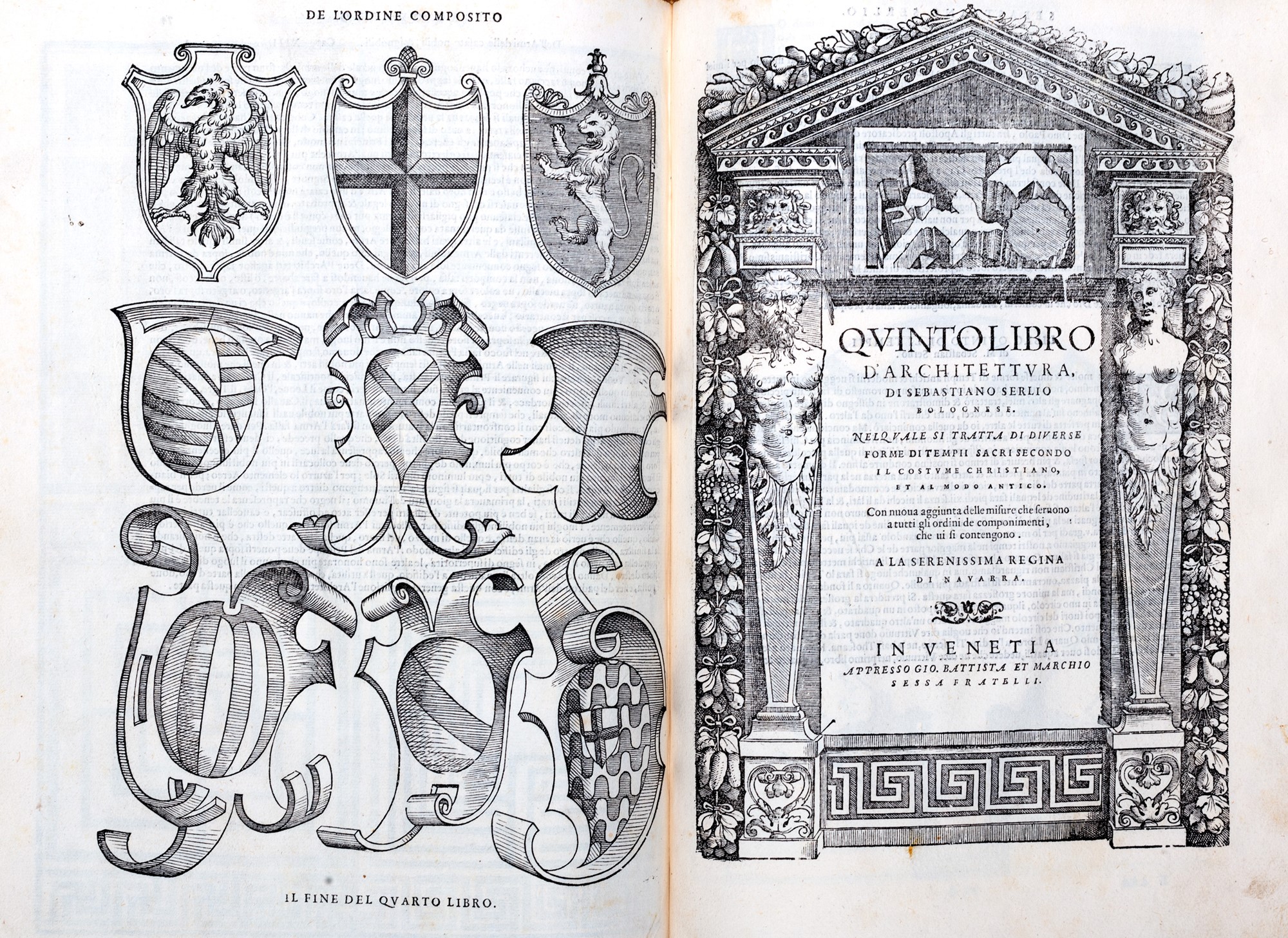 Venezia, appresso Gio. Battista e Marchio Sessa fratelli, 1559-1562. In 2°. 335 x 245 mm., suddiviso in cinque libri, al frontespizi del I volume titolo racchiuso entro cornice architettonica sostenuta da due bellissime colonne coni busti scolpiti di un uomo e una donna, decorazioni floreali tutt'intorno, al colophon del secondo libro la data MDLX con la marca tipografica dei Sessa, bel frontespizio ad apertura del terzo libro con le rovine di un tempio romano, colophon del terzo libro con la data MDLXII mentre il V libro reca la data MDLIX, moltissime incisioni nel testo, mancano al IV libro le carte 33-34 corrispondenti al bifolio II 1-2 e il fascicolo LL posposto erroneamente dopo il fascicolo OO, piccoli restauri al margine superiore degli ultimi fascicoli altrimenti splendido esemplare con la sua legatura originaria in pergamena floscia.