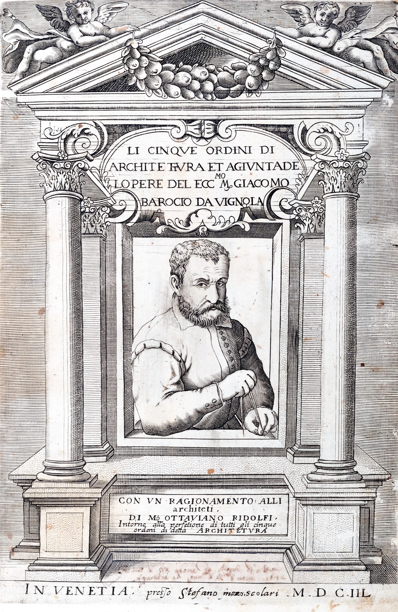 Venezia, presso Stefano Mozo Scolari, 1648. In 2°. [2], IIII-XXXII, [9] carte di tavole calcografiche, margini consunti, alcune tavole incollate, aloni, legatura coeva in piena pergamena. § Regola delli cinque Ordini d'Architettura. Bologna, Lelio dalla Volpe, 1769. In 16°. 35 tavole nel testo, modesto esemplare con macchie, legatura in mezza pelle coeva.
