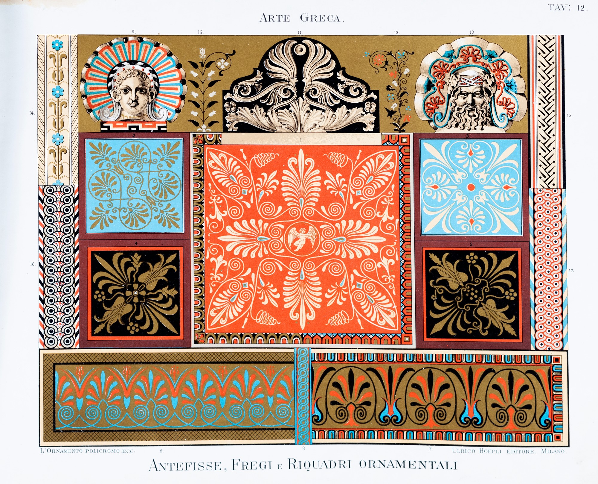 Milano, Hoepli, 1886. In 4° oblungo, 290 x 245 mm., 40 tavole "dorate e inargentate e in colori", legatura in tela editoriale con titolo al piatto, sciupata. § Camillo Boito. Ornamenti di tutti gli stili classificati in ordine storico. Milano, Hoepli, 1882. In 2°. Cofanetto editoriale contenente 303 tavole, 280 x 380 mm. § Viollet-Le Duc. Storia dell'Abitazione Umana. Milano, Editrice Lombarda, 1877. In 4°. Illustrazioni nel testo, legatura coeva in mezza pelle. § Carlo Garnier - A.Ammann. L'Abitazione Umana. Milano, Pubblicazione del Corriere della Sera (dono agli abbonati), 1893. Tavole nel testo, legatura in mezza tela coeva.