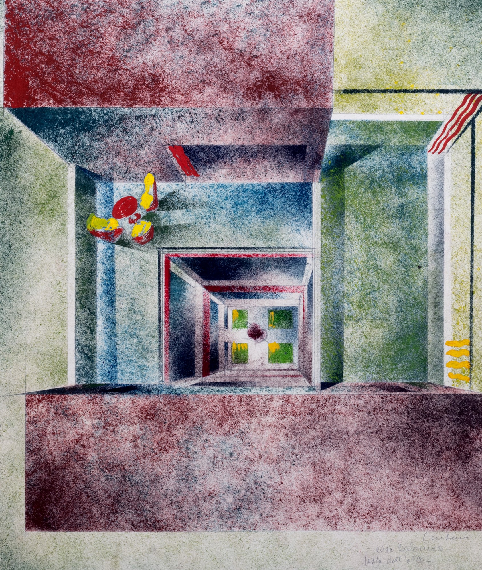senza luogo, 1935 ca, 28,5x33,7 cm, prospettiva di un interno ispirata alle linee dell'architettura costruttivista, disegno a tecnica mista (pastelli colorati, acquarelli e tempera) su cartoncino. Opera firmata a matita sul margine inferiore.