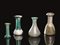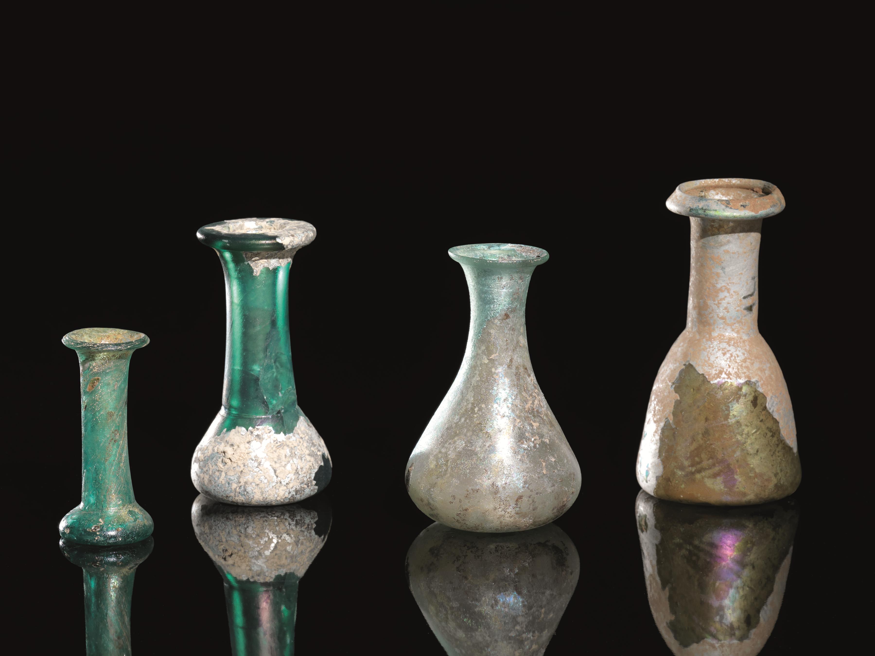 Due unguentari a collo lungo in vetro verde pesante con orlo estroflesso, ripiegato e appiatto, lungo collo troncoconico, distinto, corpo lenticolare e troncoconico, fondo piatto; due unguentari a bottiglia uno con labbro svasato e orlo arrotondato, corpo decorato a strigliature, laltro con corpo piriforme e fondo piatto (4)