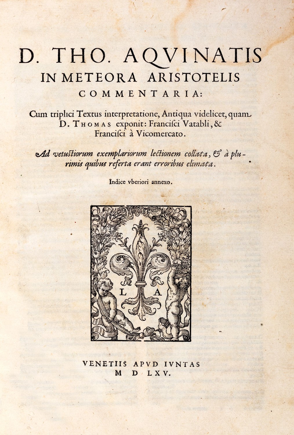 Celebre commento di San Tommaso al Meteora di Aristotele, più volte edito nel corso del Cinquecento, qui “ad vetustiorum exemplariorum lectionem collata, et à plurimis quibus referta erant erroribus elimata”.