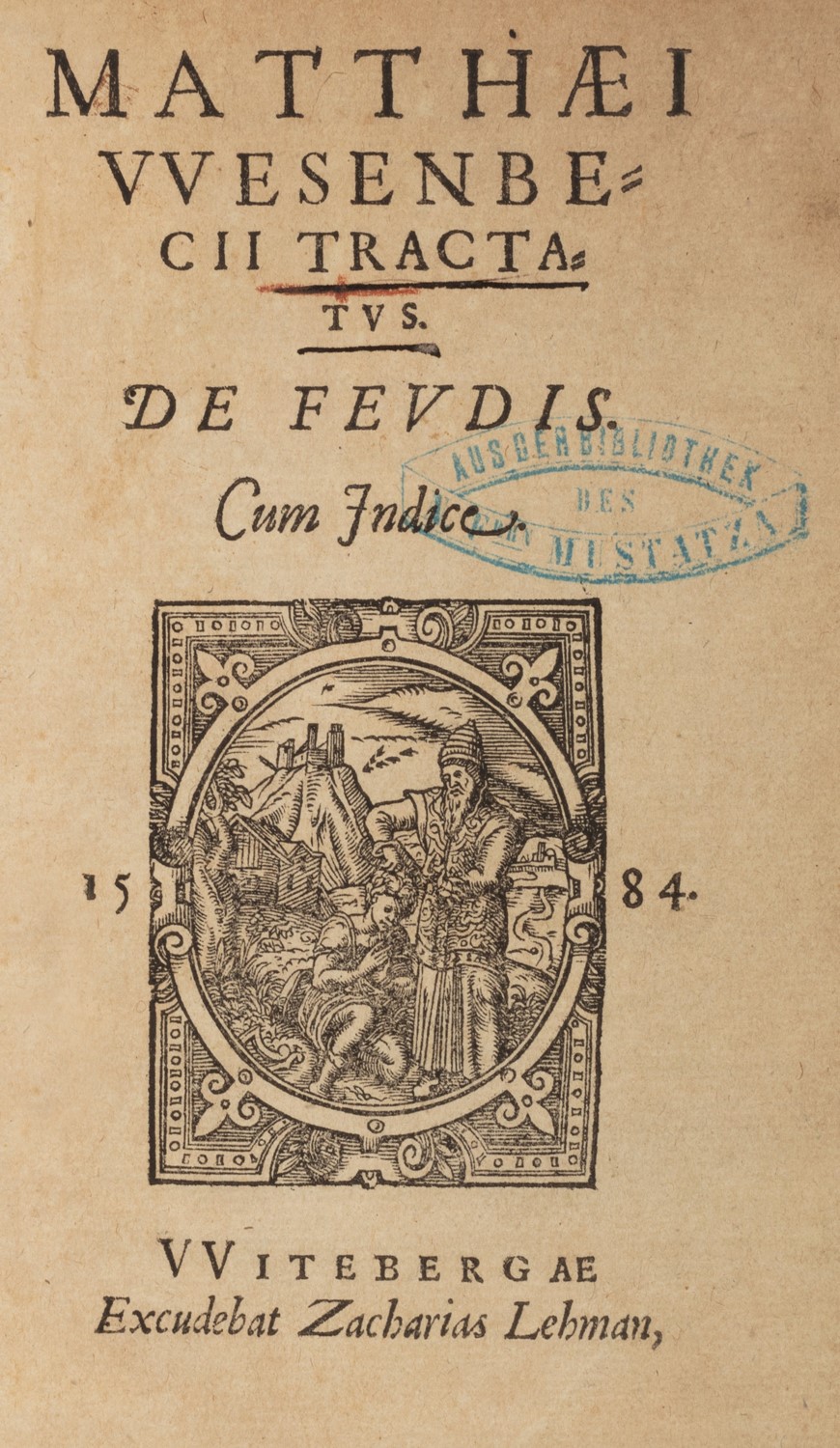 Wittenberg, Zacharias Lehman, 1584. In 8°. Vignetta calcografica al frontespizio, uniforme brunitura. Legato con: Lorenzo Silvano. De Feudi Recognitione. Coloniae Agrippinae (Colonia), Theodorum Baumium, 1578. Marca tipografica al frontespizio, uniforme brunitura, legatura coeva in pergamena rigida. Su entrambi i frontespizi timbro ovale della "Bibliothek Nikolaus Freiherrn Mustatza".