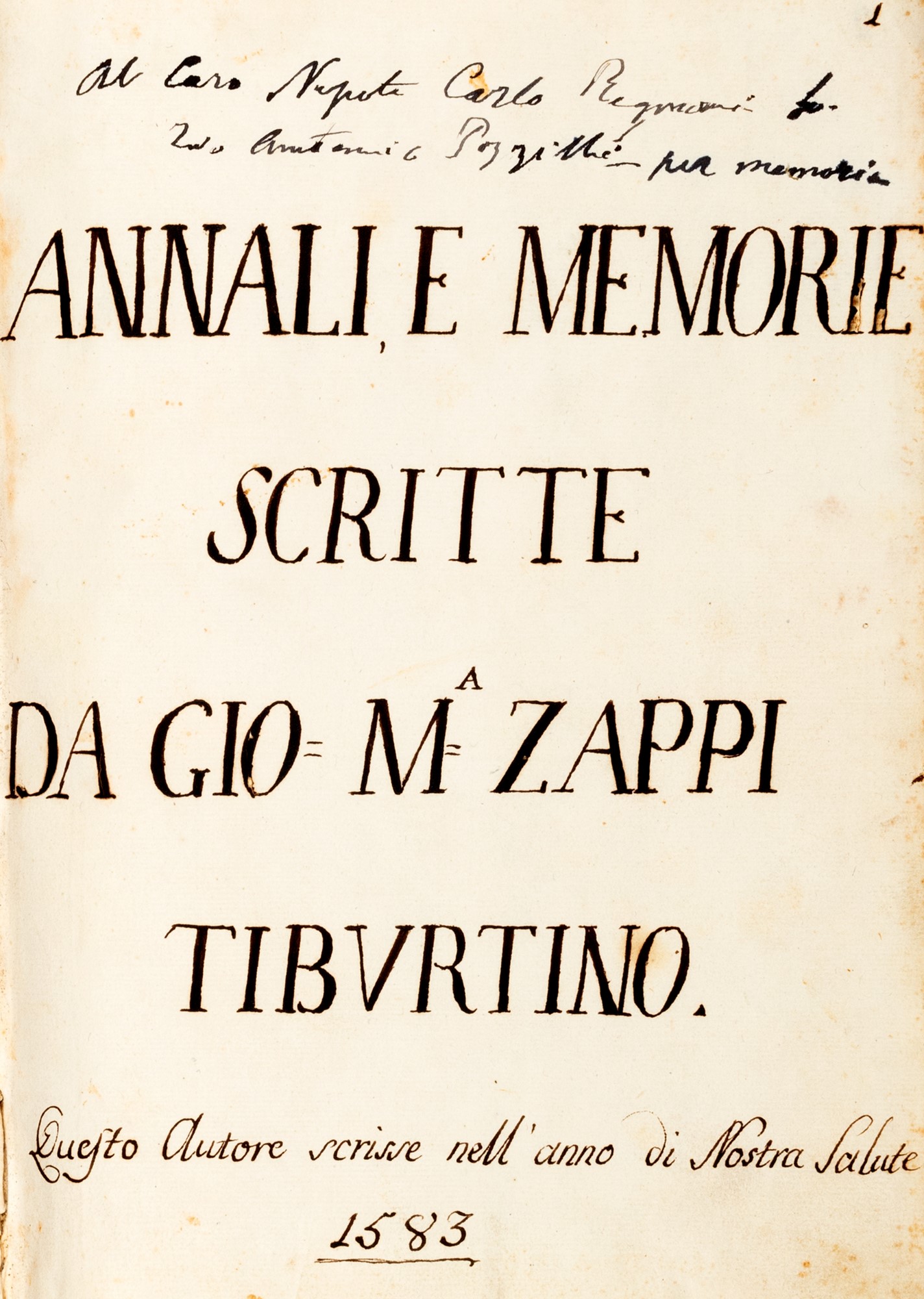 Manoscritto cartaceo di 261 carte numerate, 190 x 265 mm., legatura coeva in piena pergamena, vergato da una sola mano con un foglio iniziale del sec.XVIII dove si legge: "ANNALI E MEMORIE SCRITTE DA GIO M.A ZAPPI TIBURTINO. Questo Autore scrisse nell'anno di Nostra Salute 1583." Il manoscritto si apre con un Indice Generale, seguito da un Indice de' Capitoli, dalla dedica a Guglielmo Duca di Mantova e quindi dal testo dei Discorsi.