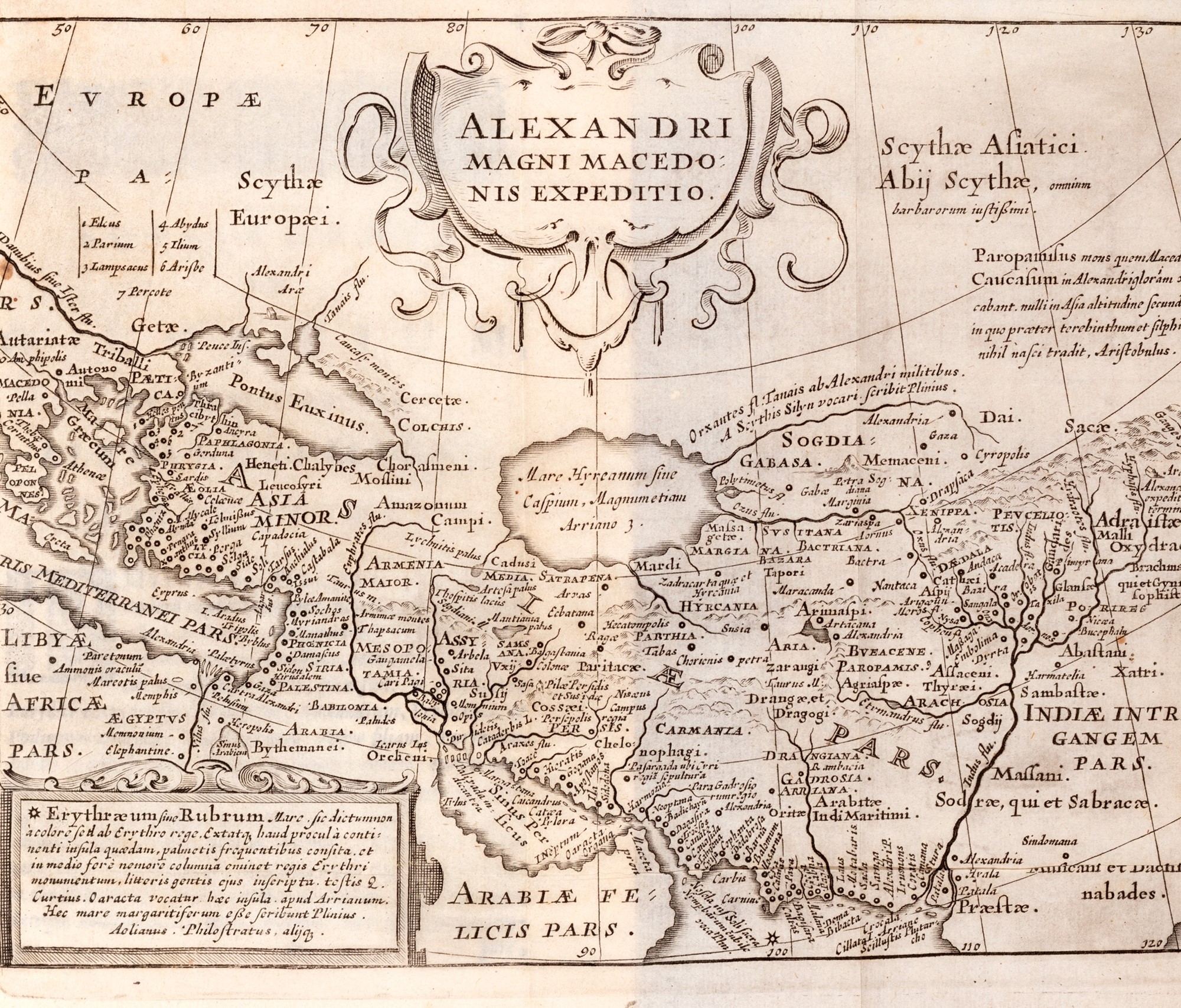 Amsterdam, Ex Officina Elzeviriana, 1673. In 8°. Elegante frontespizio inciso in rame che raffigura Alessandro Magno a cavallo che calpesta il suo nemico Dario, carta geografica "Alexandri magni macedonis ripiegata expeditio", a p.184 è inserita una tavola raffigurante un palazzo con giardino, legatura coeva in pergamena, autore manoscritto al dorso.