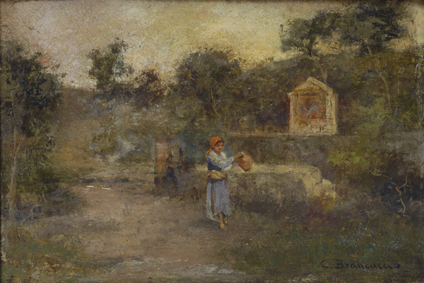 Attr. a Carlo Brancaccio ALLA FONTE Olio su tavola, cm. 18,5x27 Firma in basso a destra.