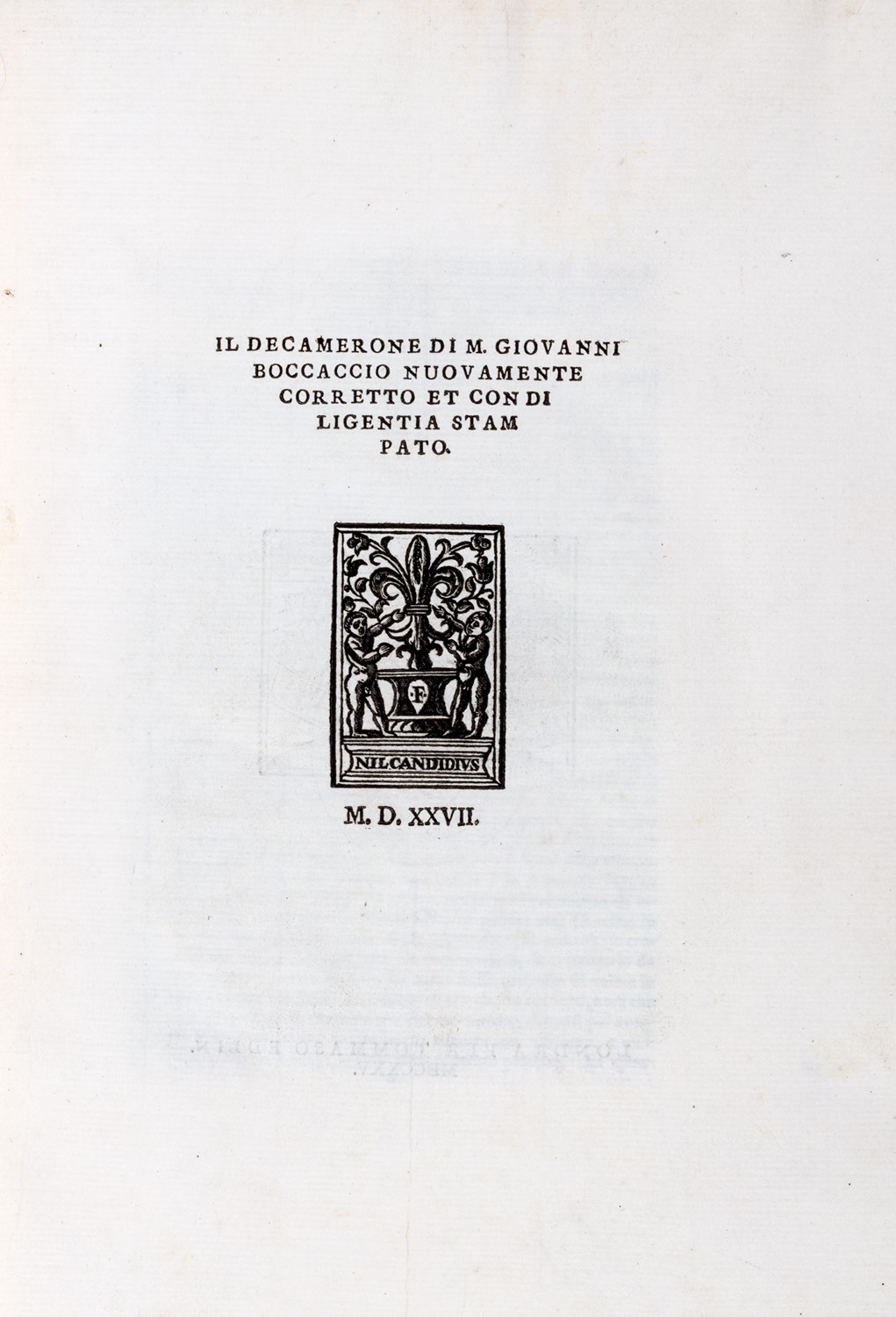 Celebre fedelissima riproduzione londinese della giuntina fiorentina del 1527, considerata la migliore edizione del Decameron; fedelmente riprodotta anche la marca tipografica dei Giunti su frontespizio e colophon, prefazione di Paolo Rolli. Gamba, 186.