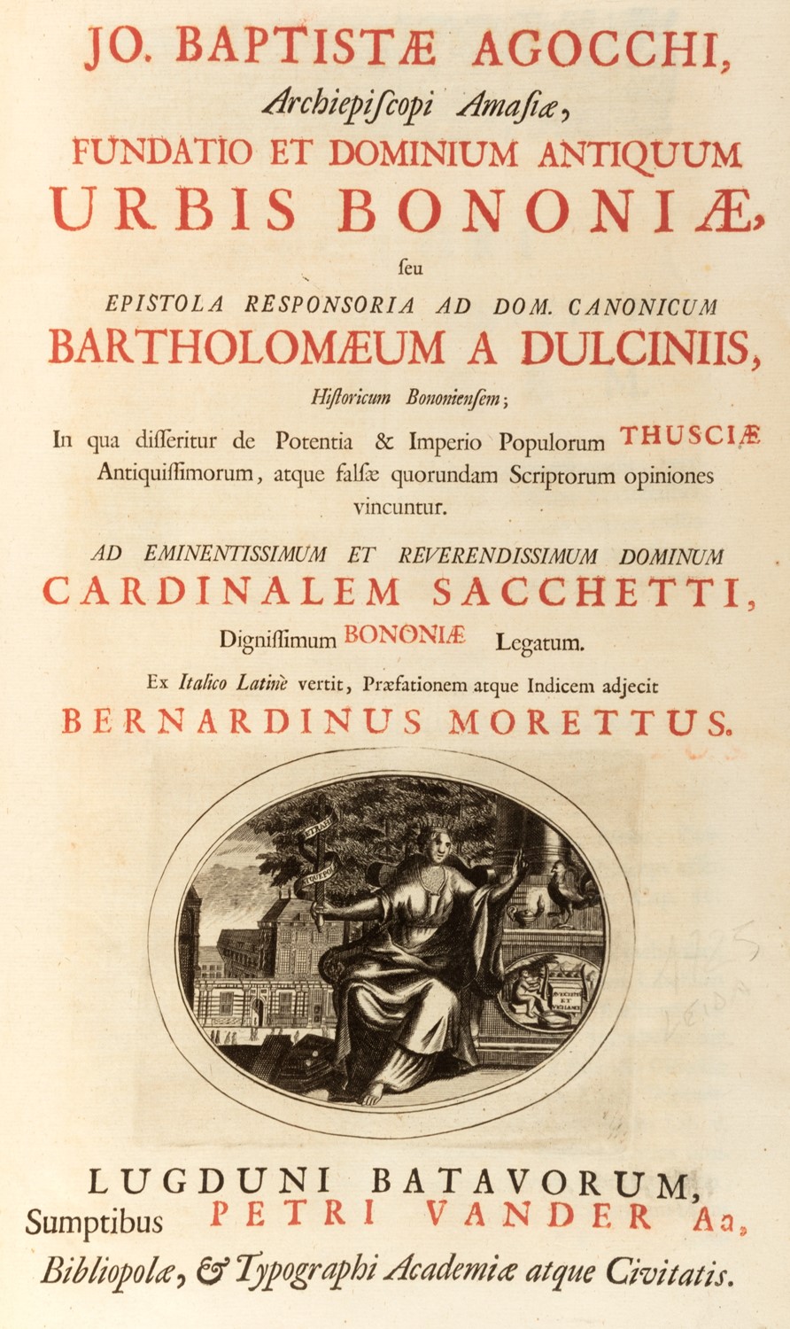 Legato con Quapnerus, Georgius, Descriptio inclytae & felicissimae civitatis Bononiae antiquae et hodiernae. Legato con Dolcini, Bartolomeo, De Bononiae vario statu ab ejus origine usque ad annum 1625. libri sex. Leida, Pieter van der Aa, [1704-1725]. Frontespizi in inchiostro rosso e nero con vignetta calcografica, iniziali e fregi xilografici, con tre tavole a piena pagina incise in rame, leggera brunitura, sporadiche fioriture, legatura del sec. XX in pelle con eleganti impressioni a secco ai piatti.