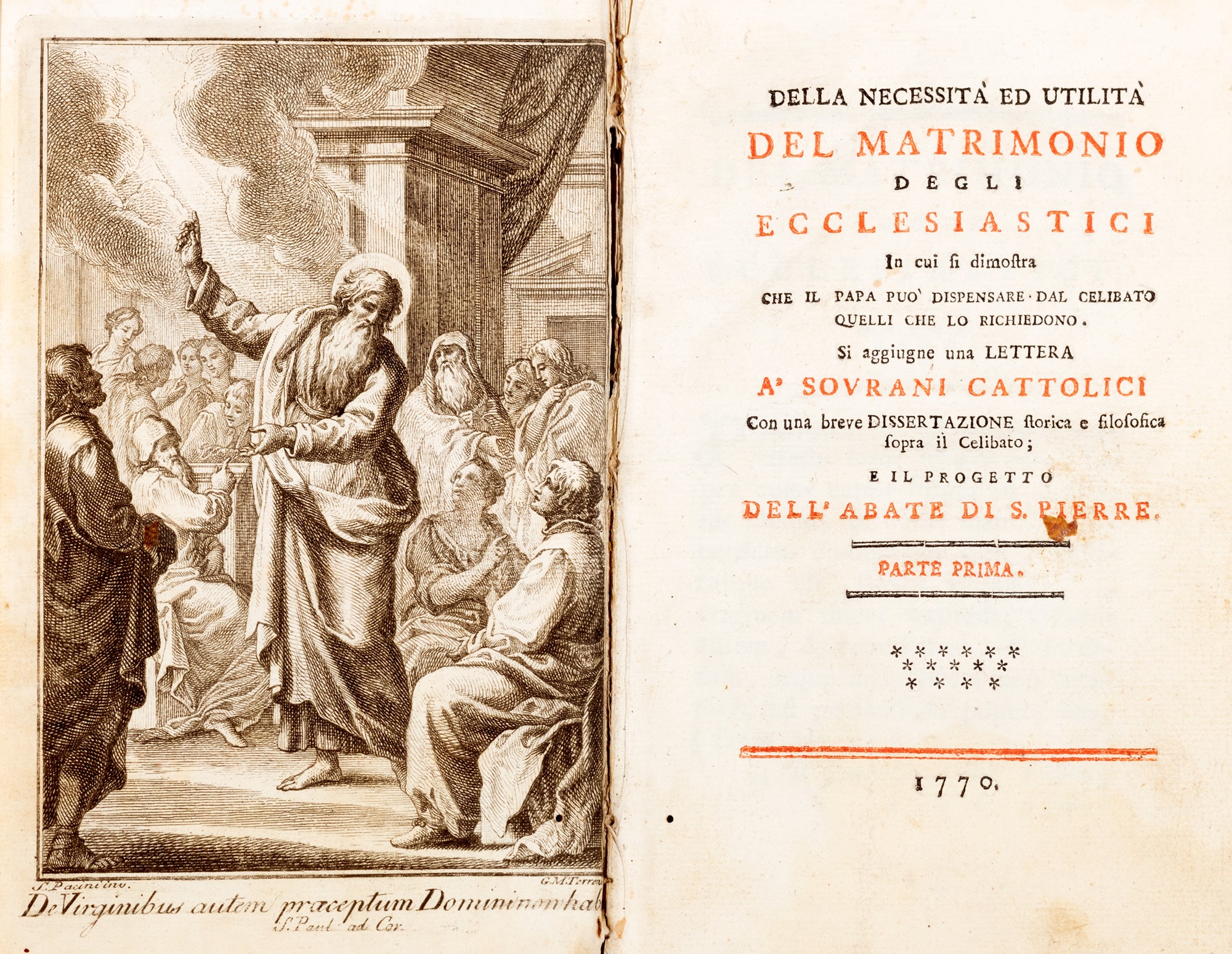 Celibato - Chiesa Cattolica - Desforges, Pierre - Della necessità ed utilità del matrimonio degli ecclesiastici in cui si dimostra che il Papa può dispensare dal celibato quelli che lo richiedono. Si aggiunge una lettera a' sovrani cattolici con una breve dissertazione storica e filosofica sopra il celibato e il progetto dell'abate di S. Pierre.