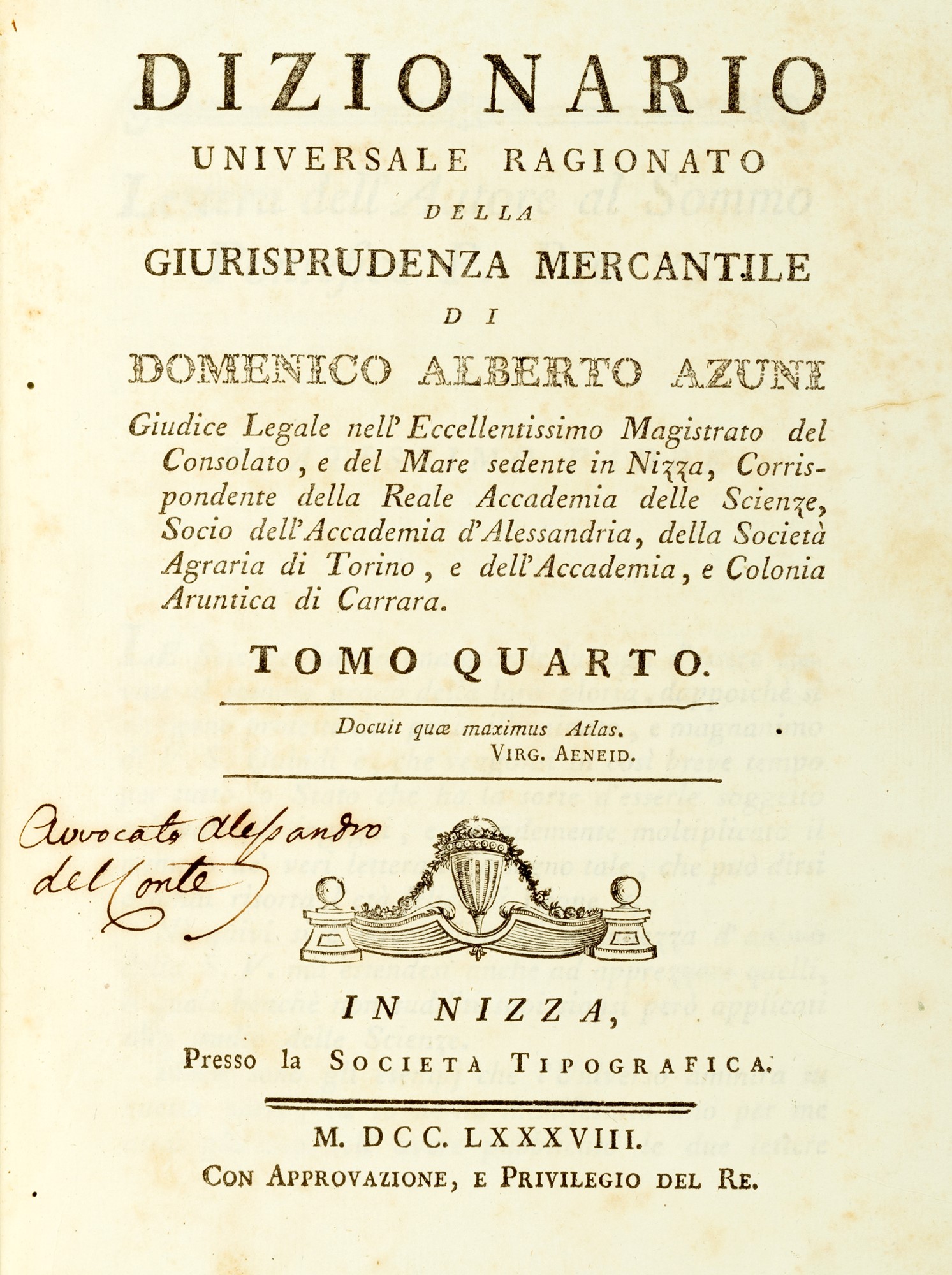 Rara prima edizione. Senatore, giurista esperto di giurisprudenza mercantile, Domenico Alberto Azuni (Sassari 1749-Cagliari 1827) si laureò in legge nella facoltà universitaria di Sassari. Si trasferì a Torino quale funzionario delle “Finanze reali” quindi a Nizza dove ebbe l’incarico di giudice del Consolato di commercio di Nizza. Pubblicò il Dizionario universale ragionato della giurisprudenza che gli conferì tale notorietà da essere nominato senatore dal re di Sardegna Vittorio Emanuele I. Ebbe incarichi importanti da Napoleone e, dopo la sua caduta, si ritirò a Genova. Poté finalmente tornare nella sua amata Sardegna nel 1826 come giudice del Consolato del commercio di Cagliari e successivamente presidente della biblioteca dell’Università.