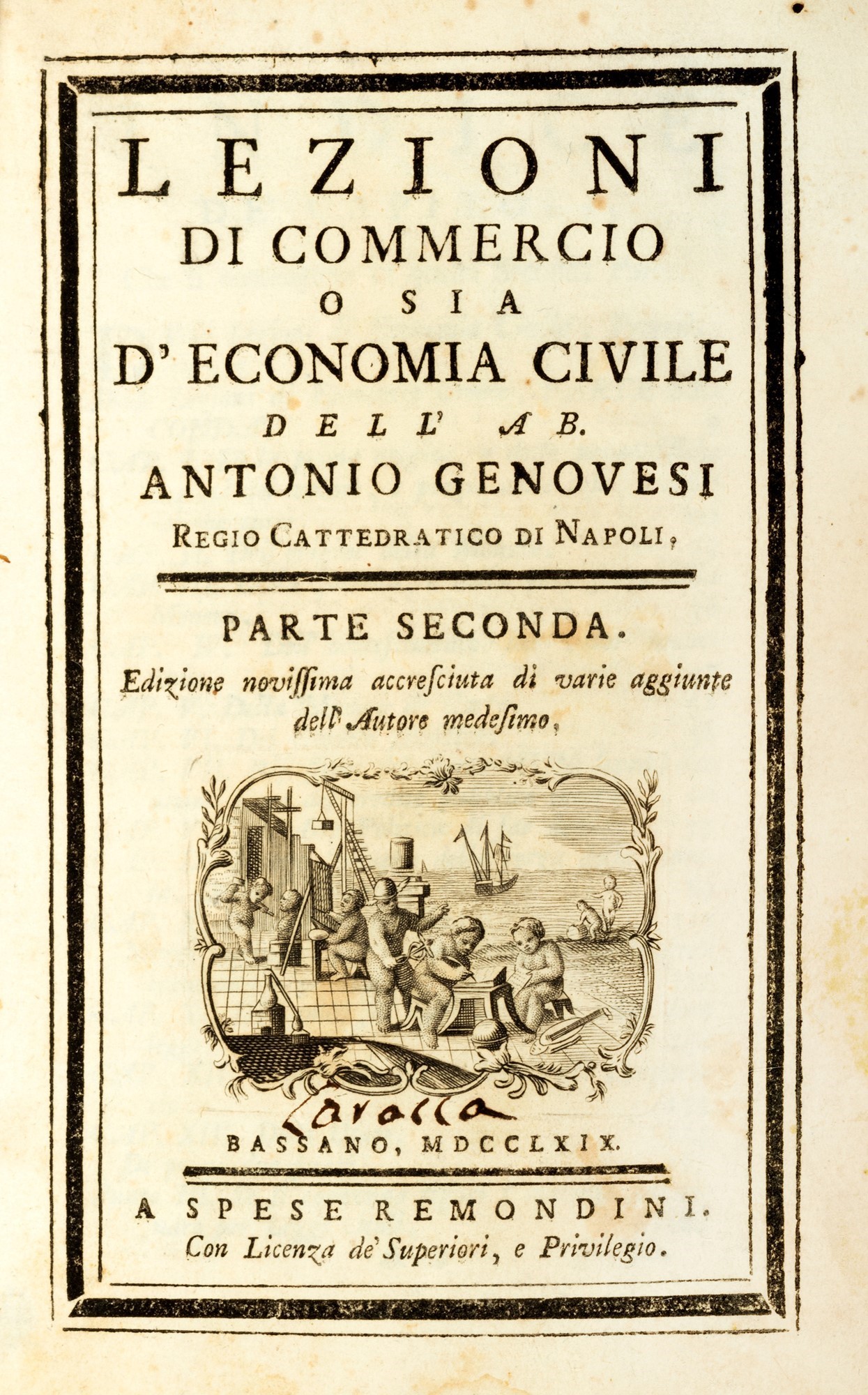 Edizione novissima, accresciuta di varie aggiunte dell'Autore medesimo. Prima edizione bassanese di questo testo pubblicato per la prima volta a Napoli nel 1765. Si tratta dell'opera più importante del filosofo ed economista Antonio Genovesi (1712-1769), tra i più importanti esponenti della scuola mercantilista in italia. Il trattato affronta in modo sistematico e completo l'economia nazionale in Italia e la teoria della domanda e offerta.
