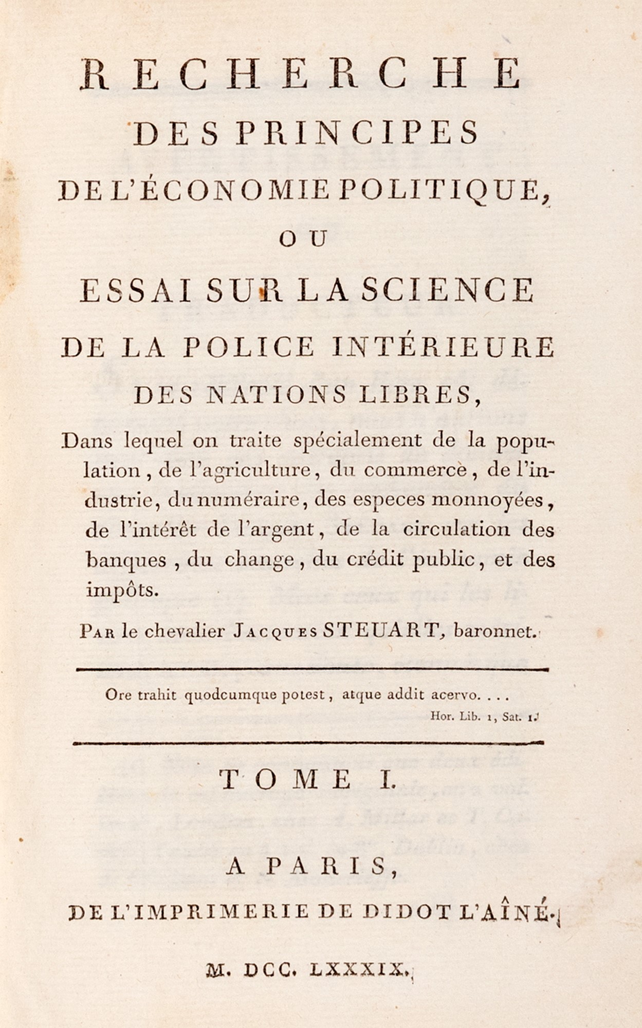Prima edizione della prima traduzione francese, dovuta a Ėtienne de Sénovert (Toulouse, 1753-Honfleur, 1831), negli stessi anni editore delle Œuvres di John Law (1790). L'originale inglese è del 1767. L’economista scozzese, sir James Denham Steuart (Edimburgo 1712-1780) fu il principale esponente dell’economia mercantilista. Sostenitore dei giacobiti che volevano riportare gli Stuart sul trono di Inghilterra e Scozia, fu costretto all’esilio per circa vent’anni e rientrò a Edimburgo soltanto nel 1763. Nella sua opera principale affronta l’economia politica in modo sistematico e affida al governo un ruolo chiave nello sviluppo economico e nella realizzazione dell’equilibrio di mercato: lo Stato deve intervenire in tutti i principali campi della vita economica. Ultimo difensore del mercantilismo in un’epoca in cui le idee illuministe e liberiste si stanno diffondendo, sostiene la regolamentazione governativa dell’economia della nazione allo scopo di aumentare il potere statale e proteggere i mercati interni dalla concorrenza