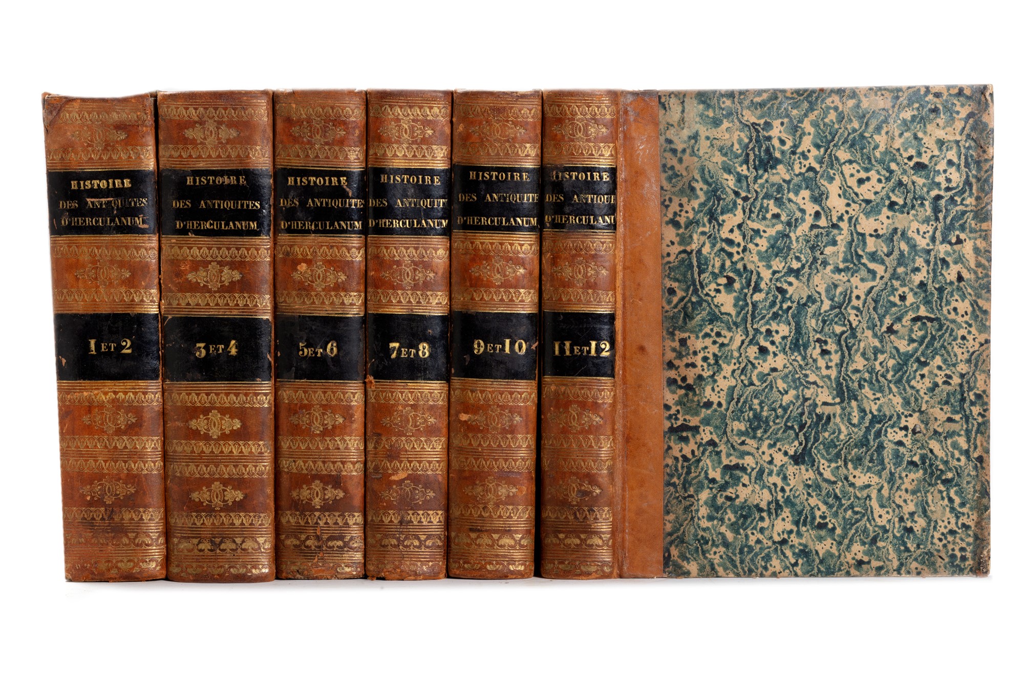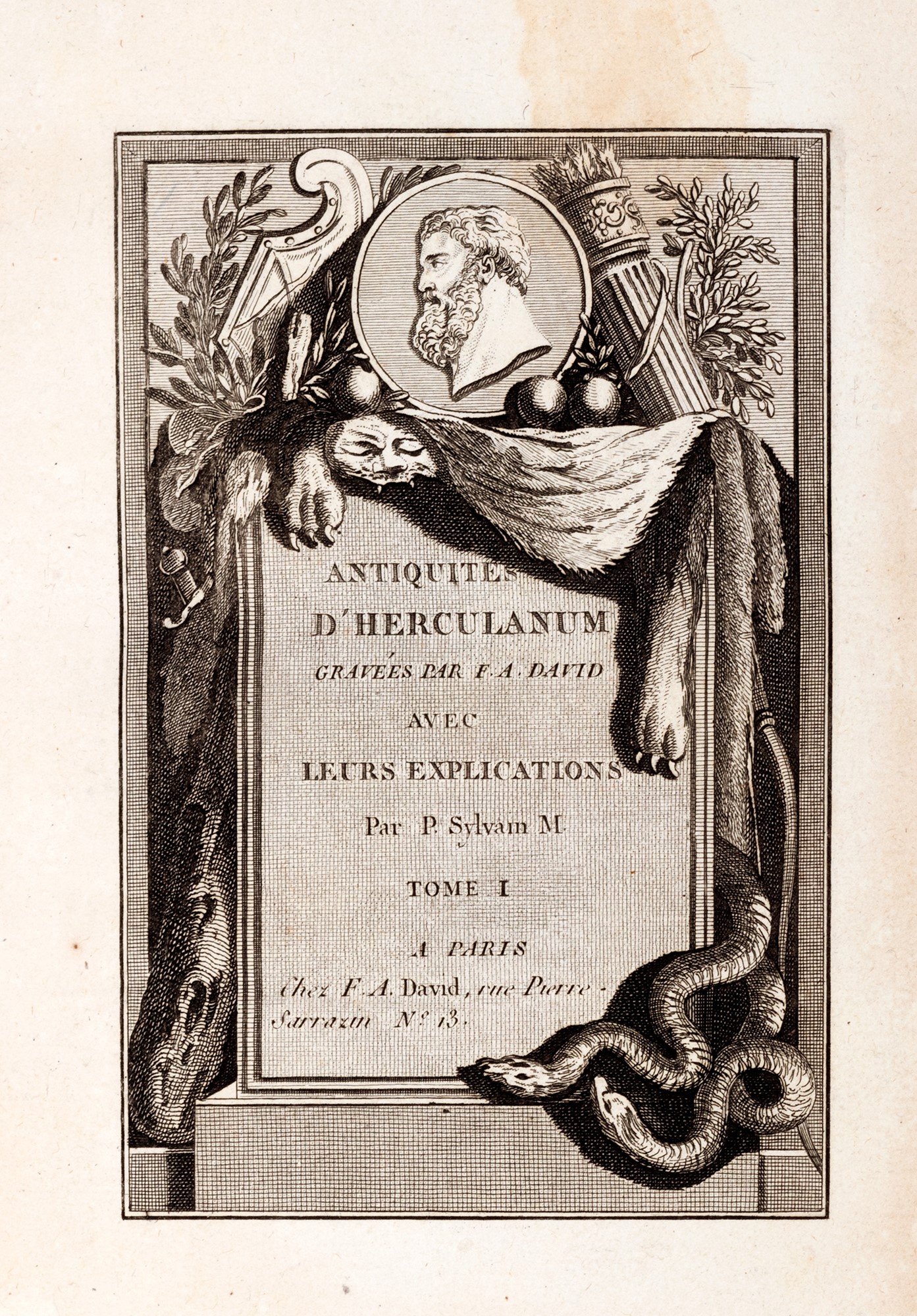 Prima edizione. Opera di pregio che illustra i ritrovamenti degli scavi di Ercolano, iniziati verso il 1738, con incisioni di François Anne David e testo di Sylvain Maréchal (1750-1803). Il XII volume, nel quale non figura il nome di Maréchal, non era previsto nel piano iniziale che si completa con l'esplicito riferimento di David a "ce onzième et dernière volume des Antiquités d'Hercolanum".