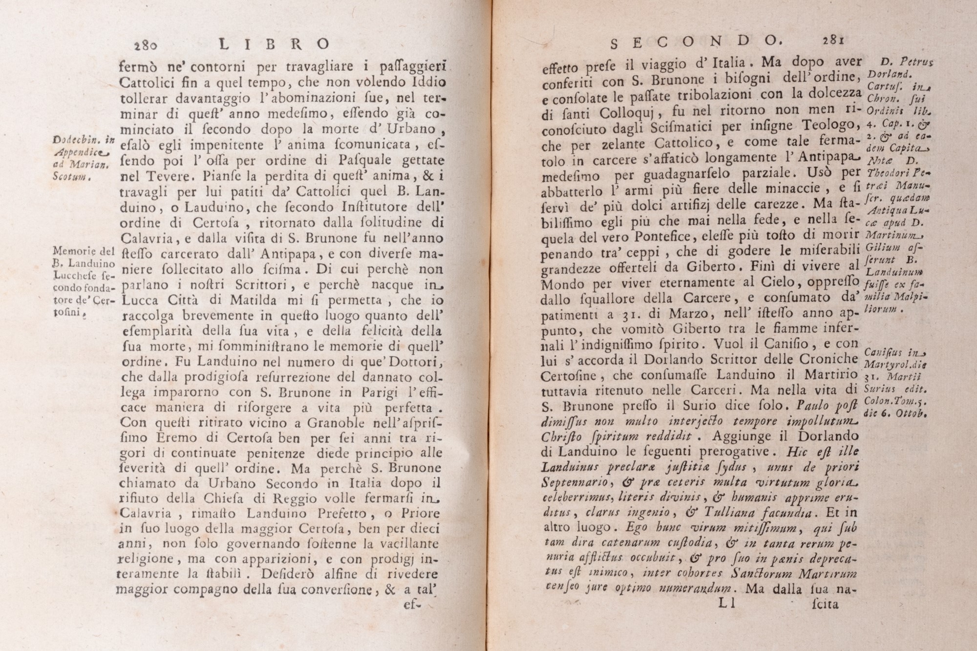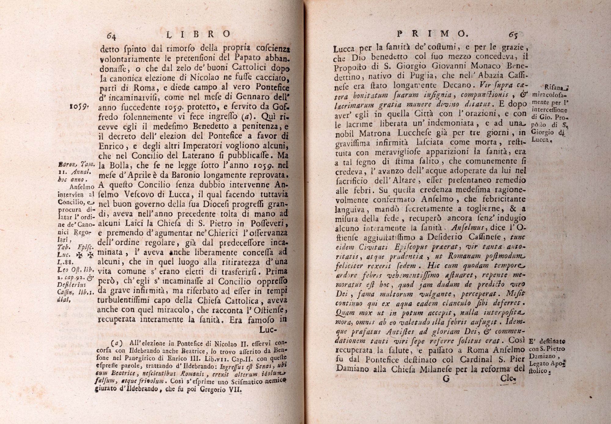 Lucca, Vincenzo Giuntini, 1756. In 4°. Con una carte di tavola incisa in rame che riproduce la miniatura del Cod. Vat. Lat. 4922 in cui Donizone offre il suo poema a Matilde ripetuta due volte, fregio al frontespizio, leggera brunitura, lievi fioriture, leggera gora d'acqua al margine inferiore di alcune carte, legatura coeva in pergamena rigida, titolo e autore impressi in oro entro tassello al dorso, lievi bruniture.