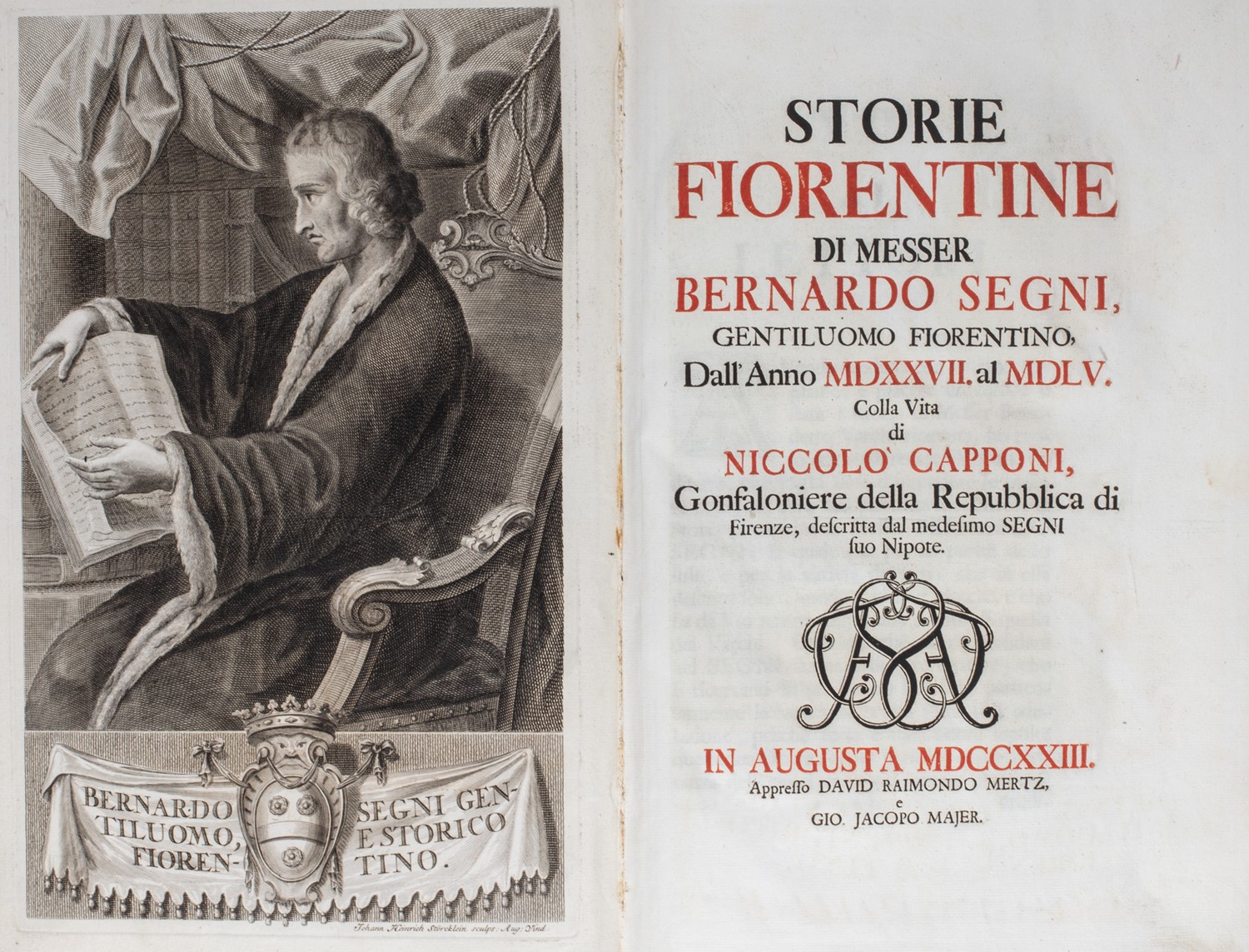 Augusta [Firenze], David Raimond Mertz, e Johann Jakob Meyer, 1723. In 2°. Occhietto, frontespizio stampato in rosso e nero con iniziali xilografiche, elaborati fregi e capilettera incisi in legno nel testo, ritratti di Segni e Capponi incisi in rame a piena pagina fuori testo, fori di tarlo al margine bianco dei fascicoli b-G e 4X - 5E fascicoli F-H lievemente allentati, rinforzo al margine interno di poche carte, qualche raro leggero alone e piccola macchia, legatura coeva in cartoncino, titolo e autore impressi in oro entro tassello al dorso, strappi con lacuna alle cerniere, qualche abrasione,