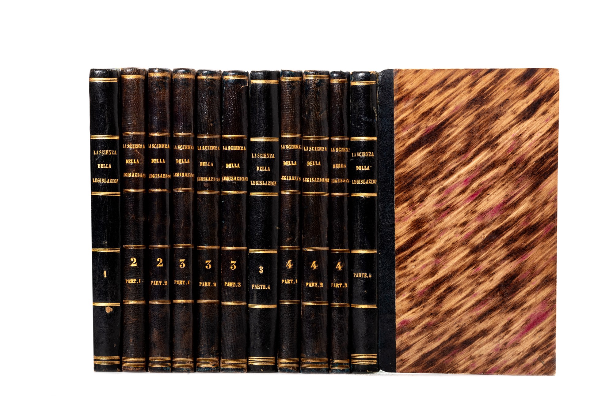 Milano, Giuseppe Galeazzi Regio Stampatore, 1784-1791 (per l'ultimo tomo postumo). In 8°. 5 tomi in 11 voll. Fregio xilografico sui frontespizi, iniziali xilografiche, qualche lieve arrossatura e fioritura, legatura di epoca successiva in mezza pelle, autore, titolo, numero di tomo impressi in oro al dorso liscio, tagli screziati azzurri. Firma di appartenenza al frontespizio del I vol. e timbri ai frontespizi. § La scienza della legislazione, Filadelfia [ma Livorno], Stamperia delle Provincie Unite, 1807. In 8°. 5 voll. Leggera brunitura, legatura di epoca successiva in mezza pelle, autore, titolo e numero di tomo impressi in oro entro tassello al dorso, lievi difetti.
