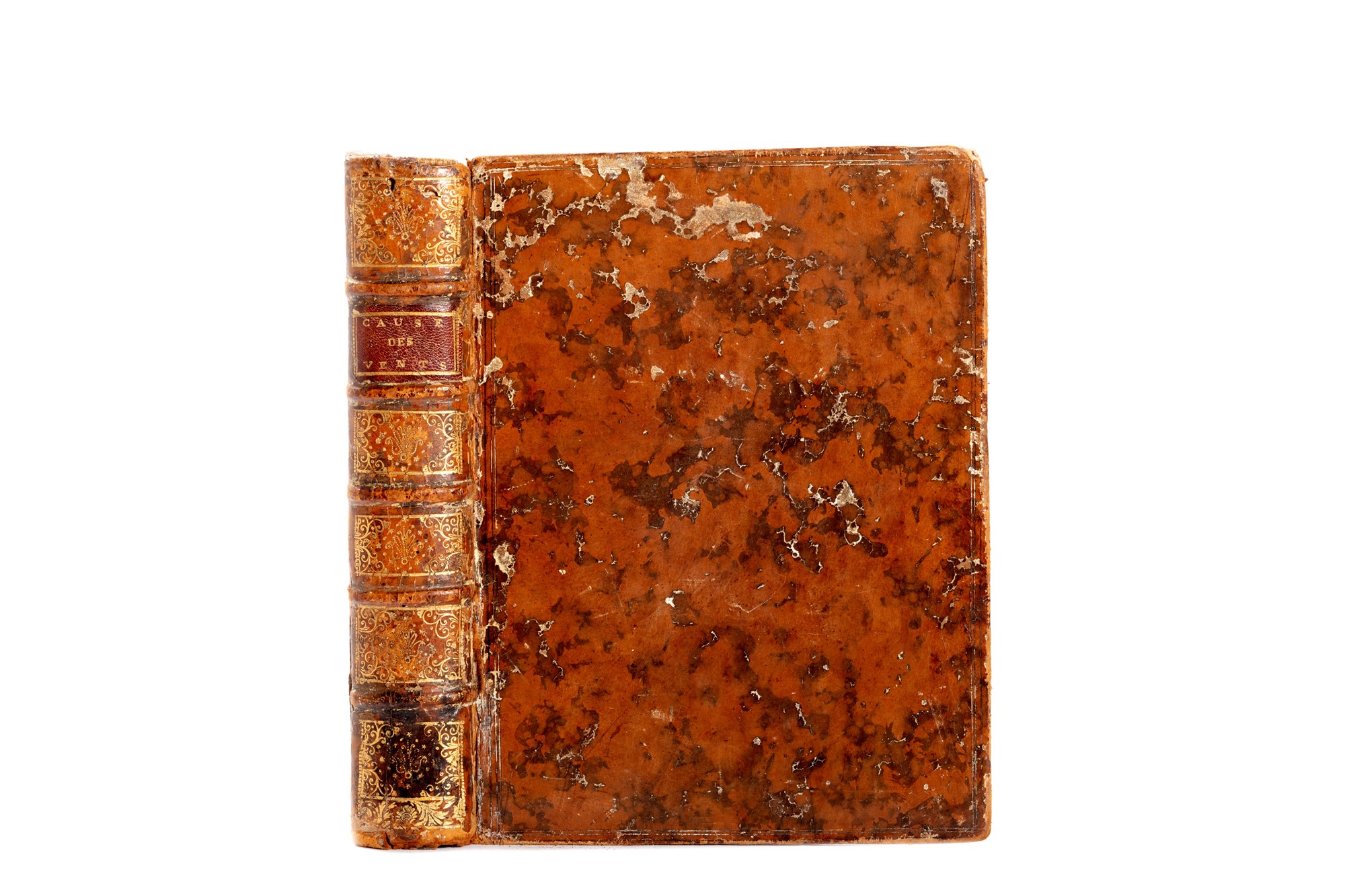 Parigi, David l'aine, 1747. In 4°. Al frontespizio vignetta con il carro di Nettuno che doma i venti scatenati da Eolo e testatina allagorica dedicata al re di Prussia, entrambe incise in rame dal Delafosse. Legato con Recherches sur la Precession des Equinoxes, et sur la Nutation de l'Axe de la Terre, Parigi, David l'aine, 1749. Con 6 tavole ripiegate in fine, 2 pertinenti alla prima opera e 4 alla seconda, bruniture, legatura coeva in vitello screziato, dorso a 5 nervi con tassello in pelle rossa con titolo in oro, tagli rossi.