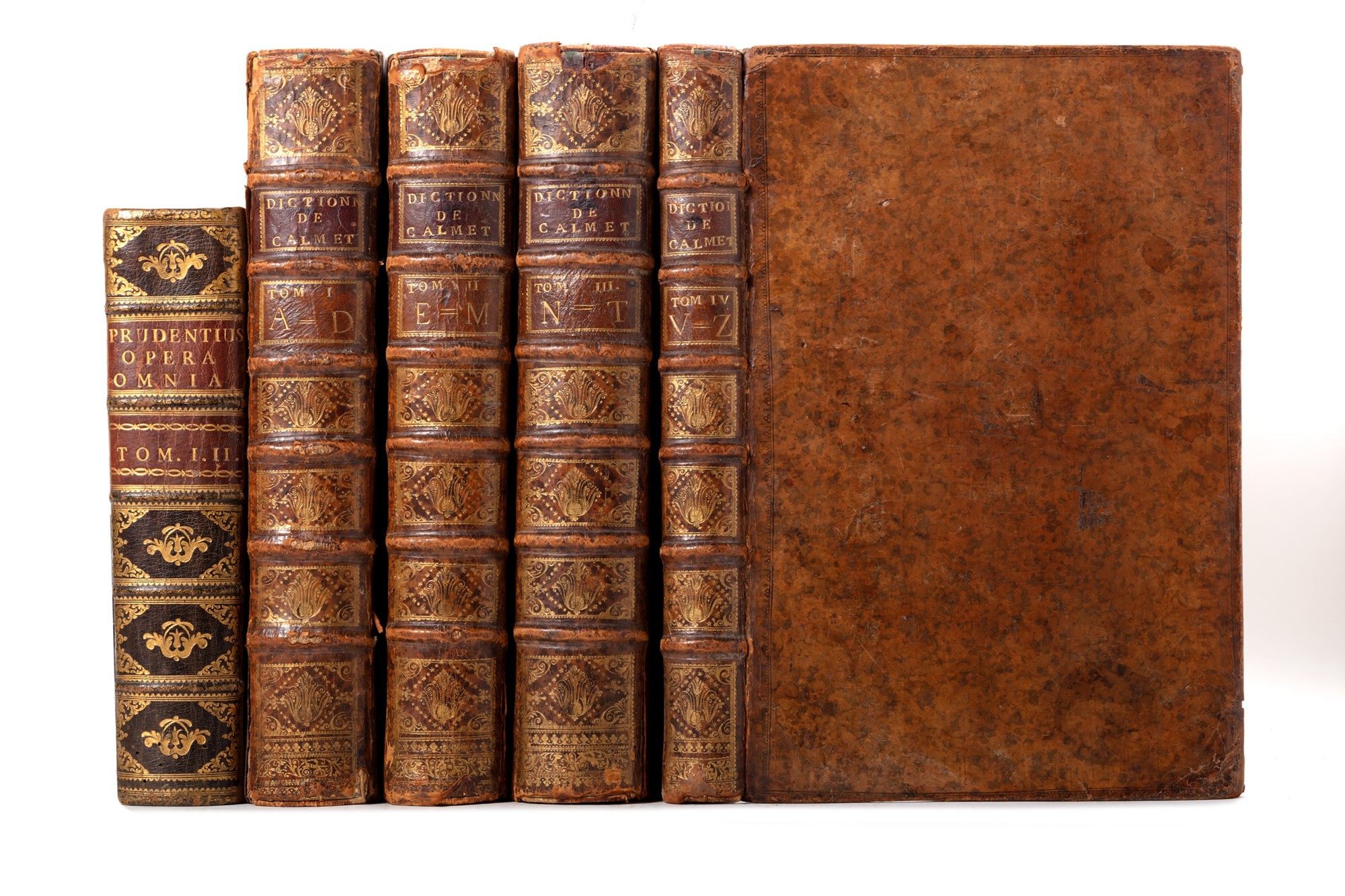 Parigi, Emery, Saugrain & Pierre Martin, 1730. In 2°. 4 voll. Antiporta figurata incisa in rame al tomo I, ai frontespizi stampati in rosso e nero grande vignetta incisa, numerose vignette incise, 7 carte geografiche di cui 5 su doppia pagina e 194 tavole incise in rame di cui 97 a doppia pagina ed 1 ripiegata, 1 albero genealogico ripiegato, brunitura leggera, legatura coeva in vitello marmorizzato, dorso a 6 nervi, ai compartimenti fregi fitomorfi impressi in oro, tasselli in pelle rossa con titolo, tagli marmorizzati, difetti alle cerniere, lievi difetti. § Prudenzio, Aurelio, Opera Omnia, Parma, Giambattista Bodoni, 1788. In 4°. 2 parti in 1 volume. Vignetta incisa ai frontespizi, carte fino a p. 65 con macchie e aloni di umido ai margini, qualche fioritura, alcune carte brunite, legatura coeva in marocchino verde a grana lunga con decorazione impressa in oro, ai piatti cornice di filetti e rotella di foglie, al centro del campo le armi di Papa Pio VI sormontate da mitria e chiavi, dorso a 5 nervi, ai comparti doppio tassello in marocchino rosso con titoli e fregi in oro, tagli marmorizzati policromi, ampie mancanze ai piatti.