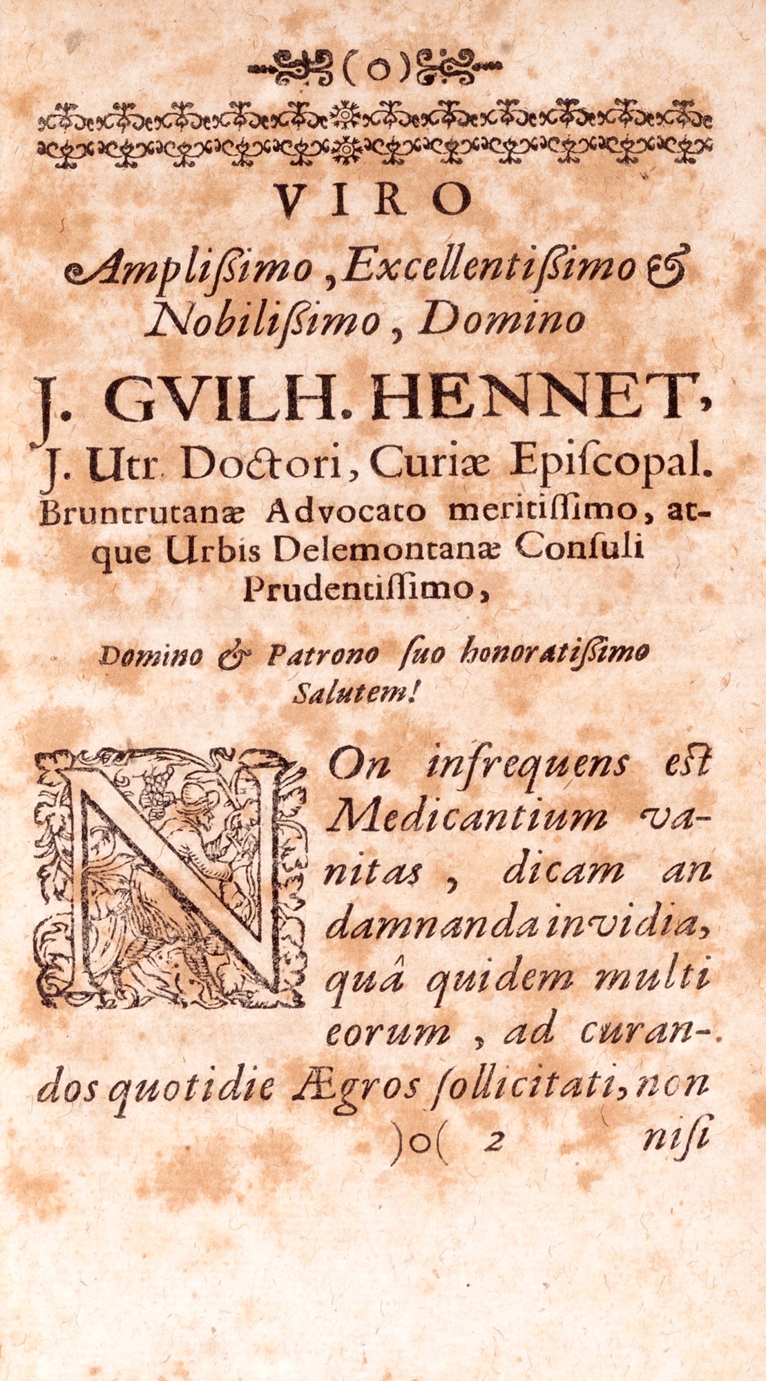 Basel, Johann Ludov, Konig, 1701. In 8° (18cm), tardo XIX secolo pelle di vitello marrone, dorso dorato, con titoli e fasce in rilievo in oro, all'interno qualche brunitura e fioritura (più pesante all'inizio) dovuta alla qualità della carta, ma per il resto ben conservata. pp (12), 764, (32), illustrato con quasi 75 piccole xilografie.
