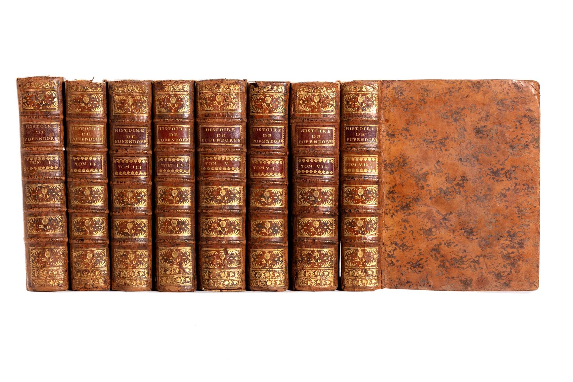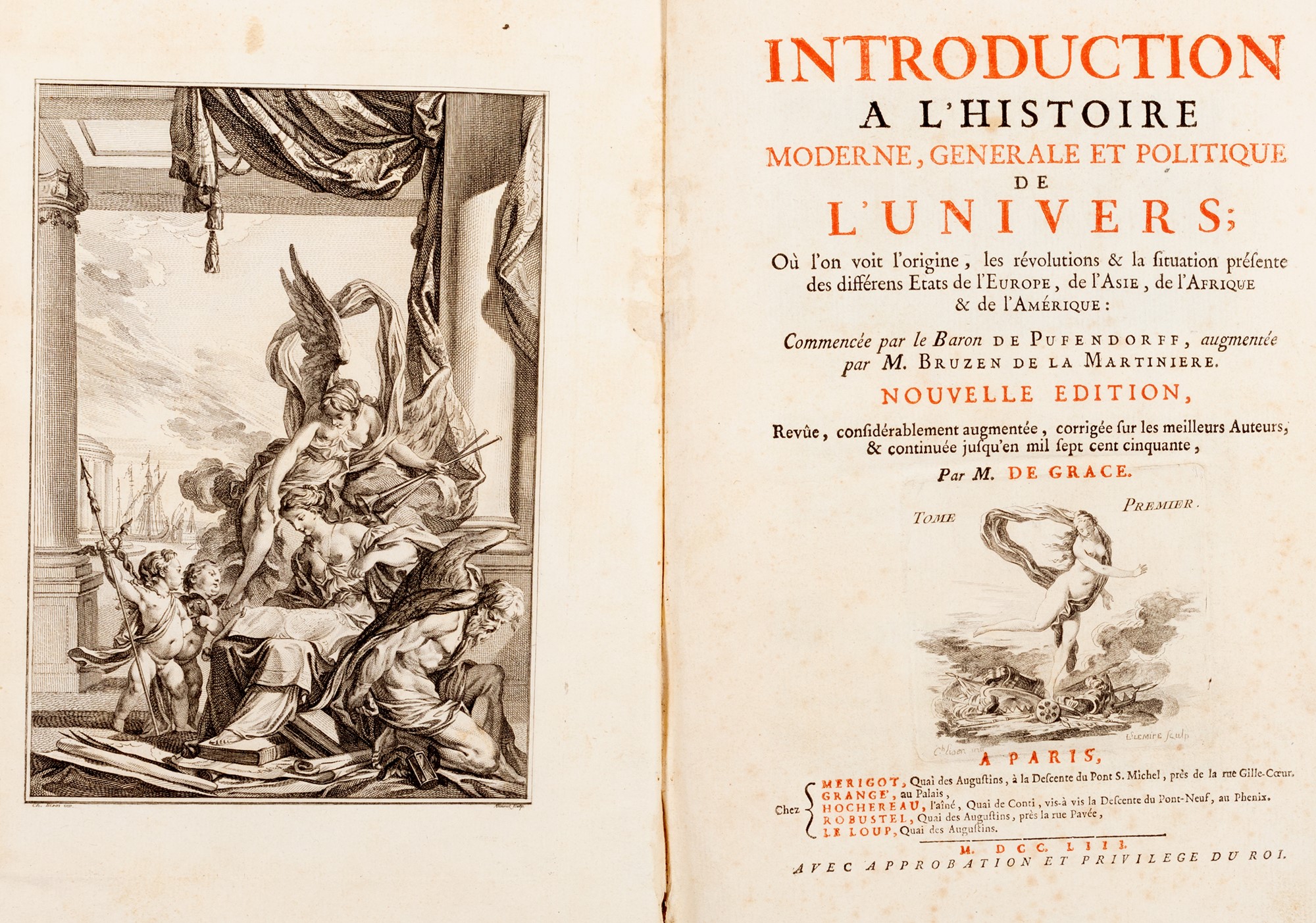 Bella edizione, rivista e ampliata rispetto alla prima. La prima edizione dell'opera di P. è del 1682, con il titolo assai meno ambizioso di Einleitung zur Geschichte der europaeischen Staaten. Nel 1710 fu tradotta in francese in 4 voll. in-12°. Poi Bruzen de La Martinière scrisse una continuazione che pubblicò nel 1738. Una ventina di anni dopo la compilazione si accresce ancora con il contributo di de Grace. Si tratta di un'opera di carattere enciclopedico che illustra la storia dell'Europa (voll.1-6), dell'Asia e del Medioriente (vol. VII) e infine dell'Africa e delle Americhe (vol. VIII) con numerose carte geografiche ripiegate. Giurista, storico, filosofo tedesco (Chemnitz 1632 -Berlino1694) figlio di un pastore protestante, Samuel von Pufendorf fu Consigliere di Stato e storiografo regio a Stoccolma, consigliere aulico a Berlino presso Federico Guglielmo di Hohenzollern, consigliere intimo e assessore, e nel 1694 fu nominato barone dalla corte di Stoccolma. In virtù di tali importanti incarichi, compì numerosi viaggi in Europa. Come professore all’Università di Heidelberg fu il primo a insegnare diritto naturale e delle genti e in seguito divenne storiografo ufficiale del regno di Svezia