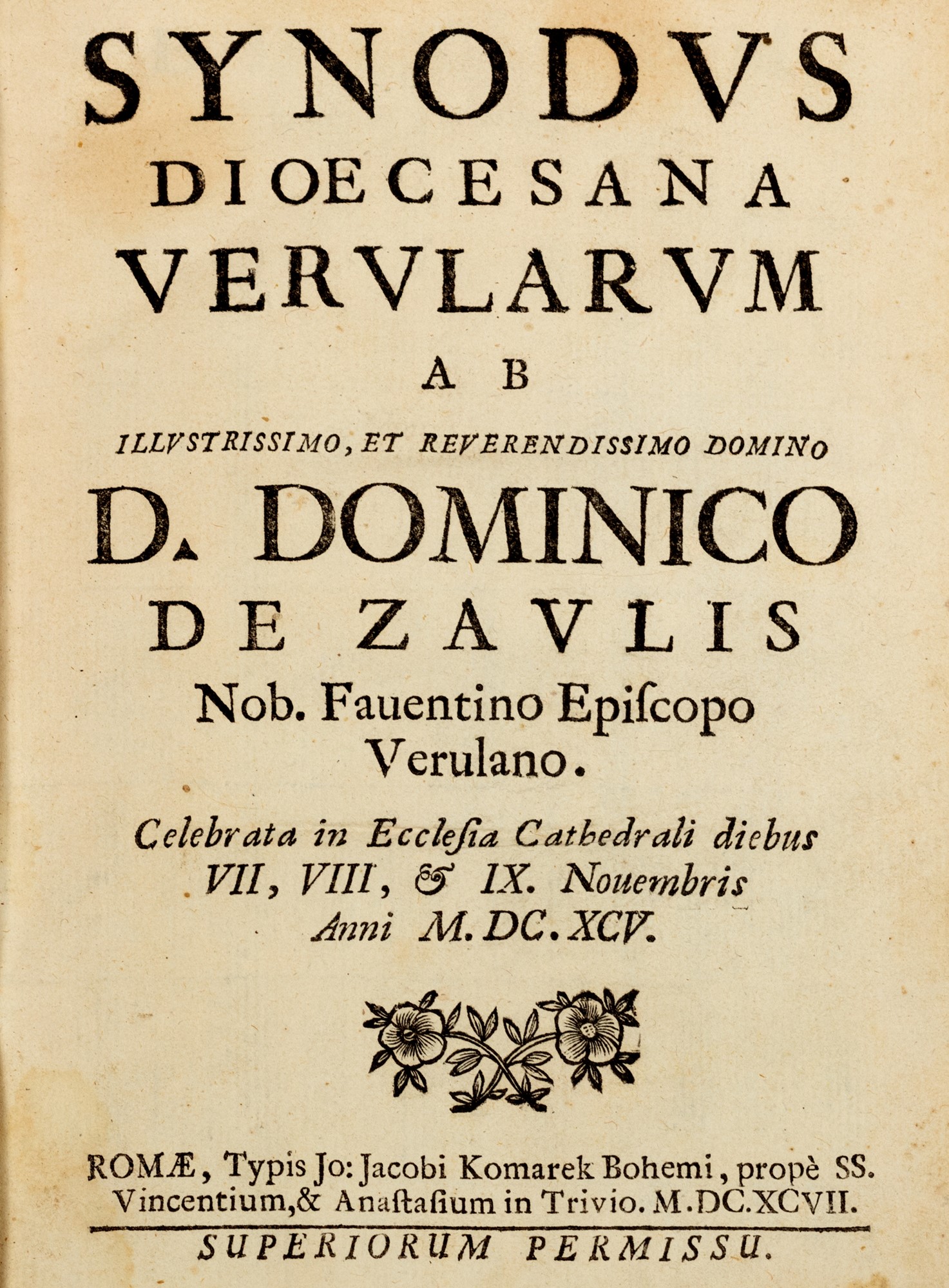 Roma, Antonio De Rossi, 1738. In 8°. Fregio inciso in legno al frontespizio, leggera brunitura, più intensa su poche carte, qualche fioritura e arrossatura, legatura coeva in cartonato in pergamena rigida, titolo manoscritto al dorso. § Guadagni, Francesco, De invento corpore Divi Francisci Ordinis Minorum Parentis, Roma, Rev. Cam. Apost., 1819. In 4°. Con una tavola ripiegata, leggera brunitura, qualche rara arrossatura, legatura coeva in mezza pergamena e carta decorata, lievi difetti. § Insieme nel lotto Diocesi di Veroli, Synodus dioecesana Verularum ab illustrissimo, et reuerendissimo domino d. Dominico de Zaulis nob. fauentino episcopo Verulano. Celebrata in ecclesia cathedrali diebus 7, 8, & 9 Nouembris anni 1695, Roma, Giovanni Giacomo Komarek, 1697. In 8°. e Esercizio della Santa Via Crucis che si pratica da una Pia Adunanza di Divoti [...] dedicato a sua Eccellenza D. Marianna Caetani, Roma, Ottavio Puccinelli, 1777.
