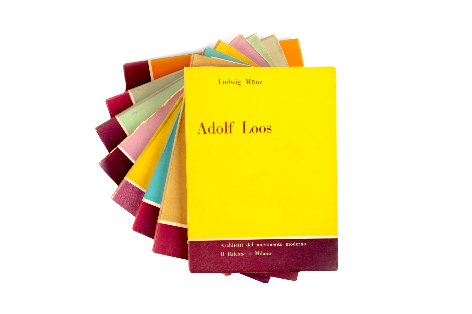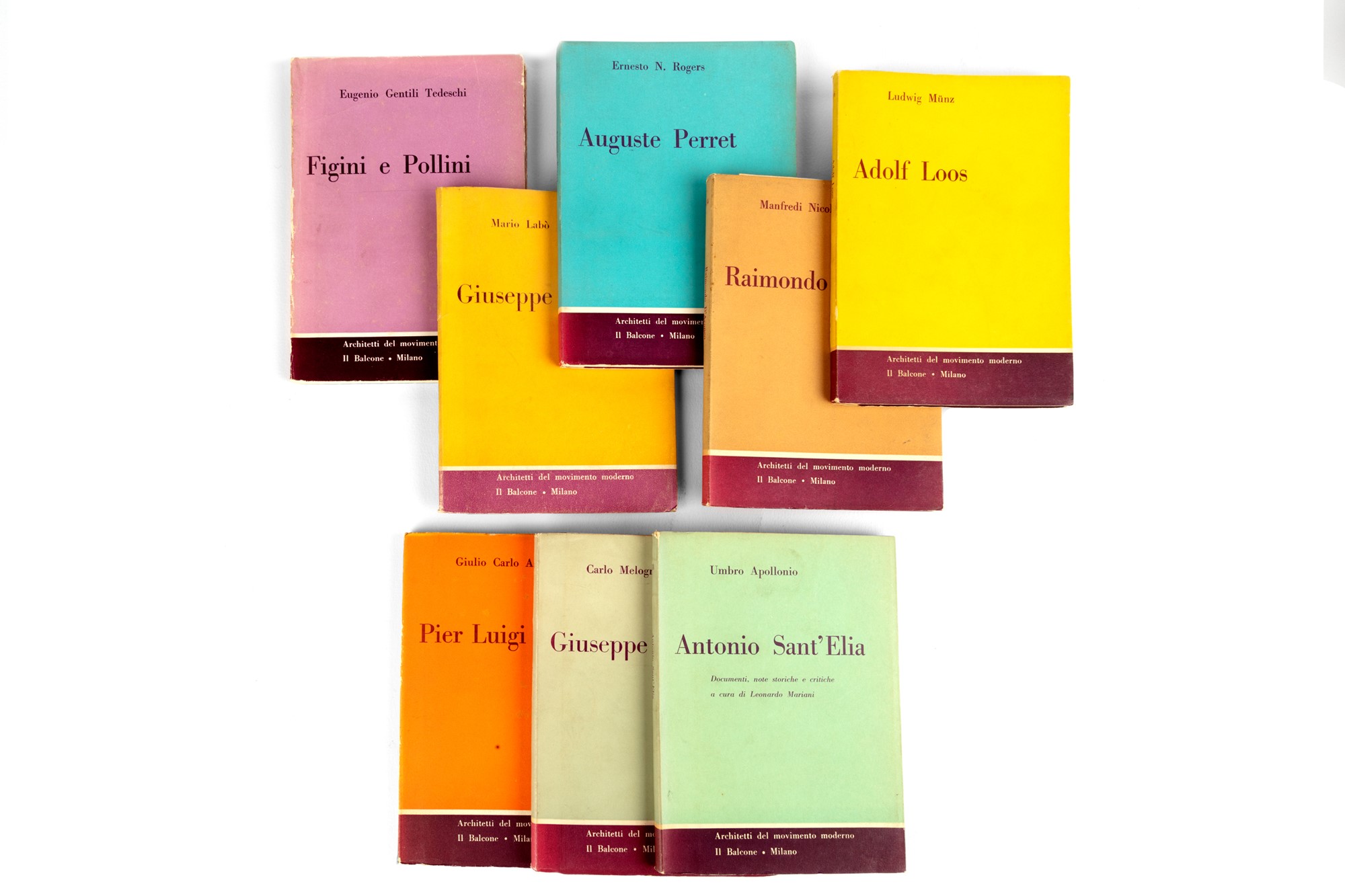 Milano, Il Balcone, "Architetti del Movimento Moderno", 1956, 16,8x12,5 cm., brossura, pp. 152, 51 illustrazioni in bianco e nero n.t. Edizione originale. § Terragni, Giuseppe, Giuseppe Terragni, Milano, Il Balcone, "Architetti del Movimento Moderno", 1947, 17x12 cm., brossura, pp. 129 (3), 38 illustrazioni b.n. n.t. Prima edizione. § Pagano Pogatschnig, Giuseppe, Giuseppe Pagano, Milano, Il Balcone, "Architetti del Movimento Moderno", 1955, 17x12 cm., brossura, pp. 172, 54 illustr. b.n. n.t. Prima edizione. § Sant'Elia, Antonio; Aollonio, Umbro, Antonio Sant'Elia. Documenti, note storiche e critiche a cura di Leonardo Mariani, Milano, Il Balcone, "Architetti del Movimento Moderno", 1958, 17x12 cm., brossura, pp. 150, 44 illustrazioni b.n. n.t. § Nervi, Pier Luigi; Argan, Giulio Carlo, Pier Luigi Nervi, Milano, Il Balcone, "Architetti del Movimento Moderno", 1955, 17x12,4 cm., brossura, pp. 109 (3), 8 tavole doppie b.n. e 24 tavole n.t. "La coscienza del necessario confluire dell'architettura "tecnica" nel problema estetico generale dell'architettura moderna è il punto di partenza della ricerca tecnica di Pier Luigi Nervi, che si pone come obiettivo principale un valore formale: nelle strutture di materiali plastici la forma non è soltanto la manifestazione sensibile o la rappresentazione plastica delle forze costruttive, ma un agente essenziale del loro determinarsi e del loro organizzarsi in sistemi di equilibrio" (dal risvolto di copertina). Prima edizione. [Bibliografia: Marini 1966: pag. 420]. § Luigi Figini e Gino Pollini, Milano, Il Balcone, Architetti del Movimento Moderno, 1959, 17x12,4 cm., brossura, pp. 160, 58 illustrazioni b.n. n.t. Prima edizione. § Perret, Auguste; Rogers, Ernesto Nathan, Auguste Perret, Milano, Il Balcone, "Architetti del Movimento Moderno", 1955, 17x12 cm., brossura, pp. 176, 44 illustrazioni b.n. n.t. (alcune a fogli ripiegati). Edizione originale. § Insieme nel lotto Raimondo D’Aronco