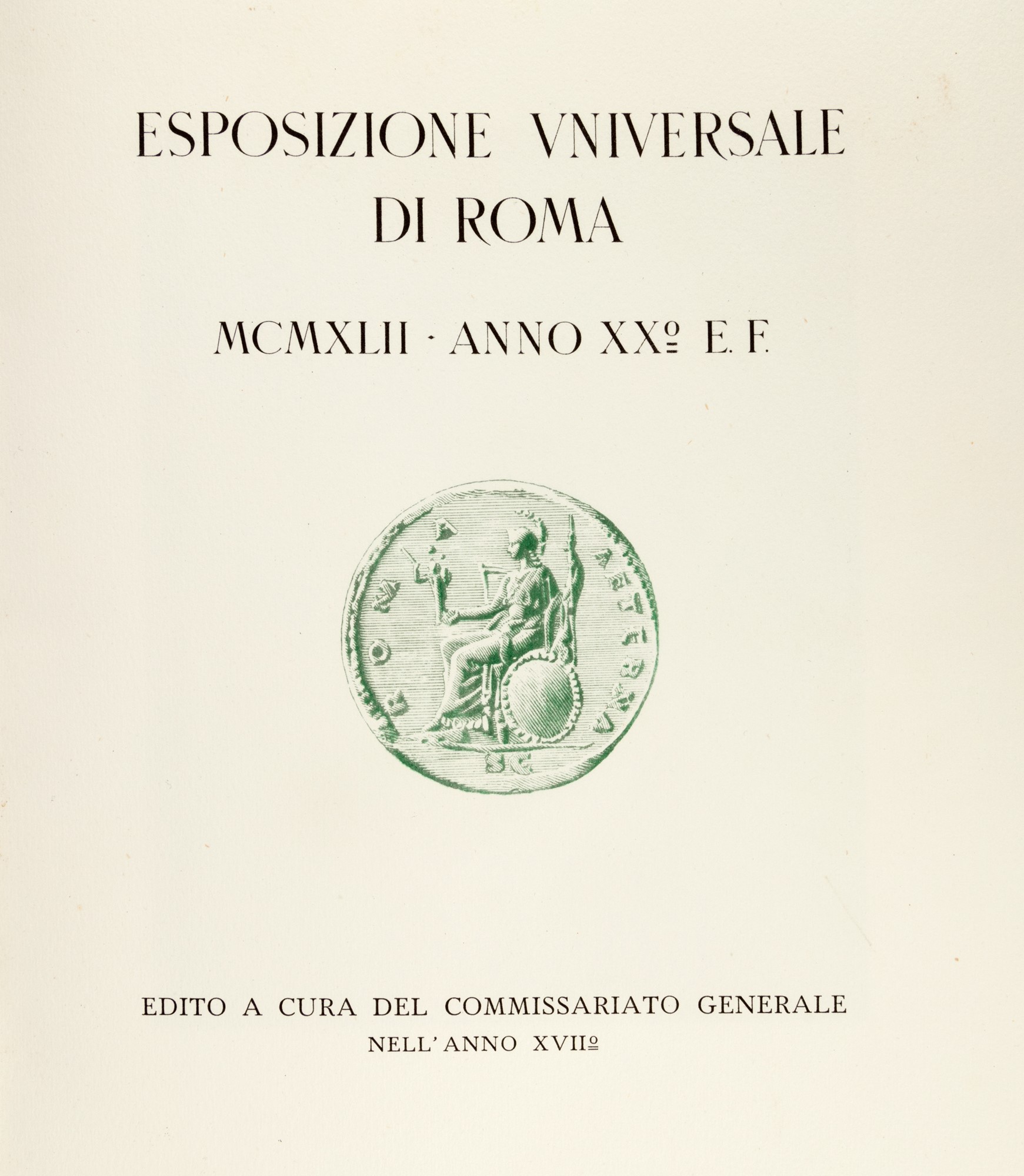 Roma, Commissariato Generale dell'Esposizione Universale di Roma, 1939, 30x25,5 cm., legatura in piena pergamena con titoli e stemma impressi in oro, custodia, pp. 88 (4), 2 ritratti in seppia, 16 bellissime tavole a colori con progetti di Sironi, Dazzi, Quaroni ecc. e 10 illustrazioni e tavole b.n. n.t. Fra i collaboratori vi furono gli architetti Libera, Moretti, Muratori, La Padula, Samonà, Michelucci, Figini e Pollini, Quaroni, Muzio e del Debbio. Il libro illustra il progetto dell'Esposizione Universale di Roma prevista per il 1942 (la famosa "E 42") che non fu realizzata a causa della guerra. Alcune macchie sulla copertina.