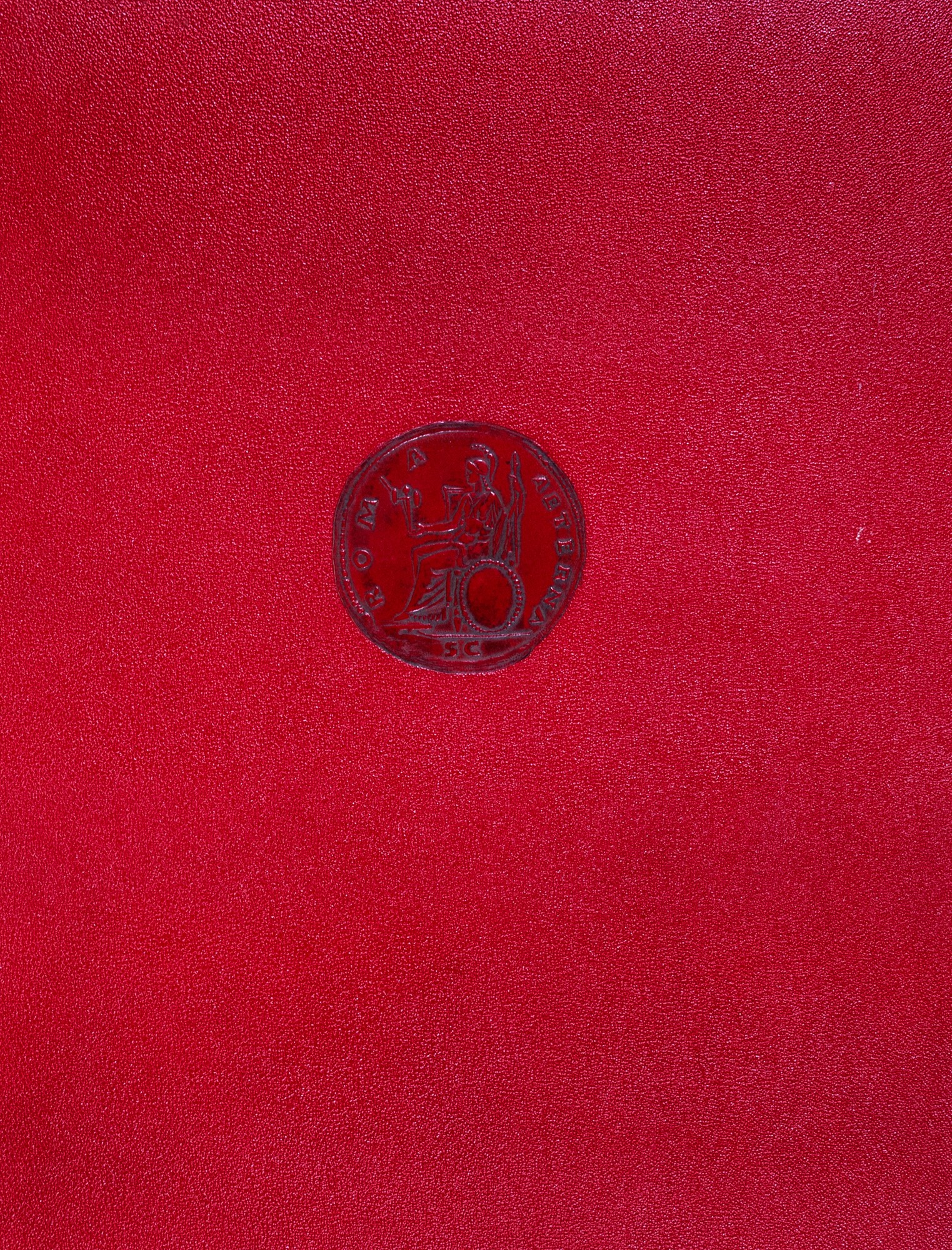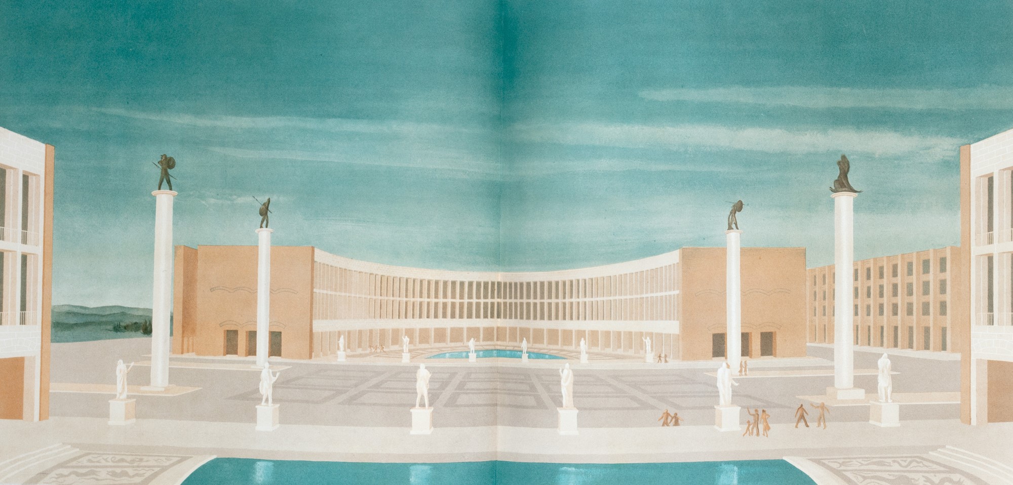 Roma, Commissariato Generale dell'Esposizione Universale di Roma, 1939 (4 aprile), 59x45 cm., legatura editoriale in marocchino, medaglione inciso al piatto, titolo in oro al dorso, custodia in canapa con titolo impresso sul piatto anteriore, pp. 87 (3), 2 ritratti in seppia di Vittorio Emanuele III e Benito Mussolini, due tavole con la riproduzione in autografo della presentazione al libro di Mussolini, 5 tavole a colori (1 di G. Quaroni, 1 di Mario Sironi, 1 con riproduzione di un affresco romano, 2 piantine) 3 tavole doppie a colori con disegni architettonici; 3 tavole b.n. su fondo beige, 1 tavola b.n., 1 tavola doppia b.n. con disegni architettonici; 5 vignette a colori, 3 vignette a sanguigna, 3 vignette b.n. su fondo beige, 1 vignetta virata in bleu, 2 vignette b.n. con disegni architettonici. Prefazione di Vittorio Cini.