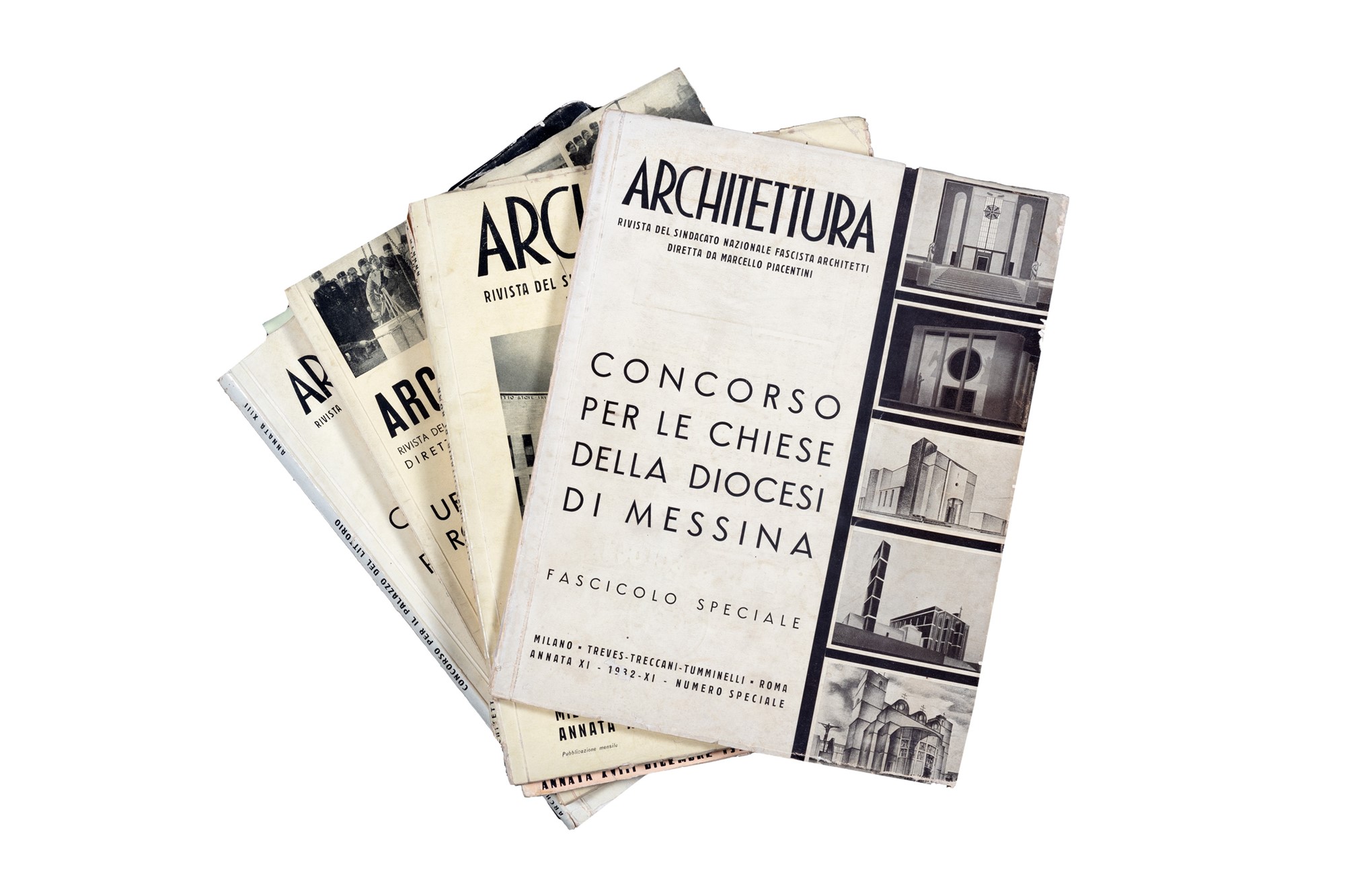 Concorso per il Palazzo del Littorio. Fascicolo speciale con 43 progetti e 390 illustrazioni, Milano, Architettura Rivista del Sindacato Nazionale Fascista Architetti - Fratelli Treves Editori - Annata XIIII, 1934, 29,3x22,8 cm., brossura, pp. (12) 127 (9), fascicolo speciale interamente illustrato b.n., fuori numerazione. Presentazione di Marcello Piacentini. Progetti di Luigi Cosenza, Gruppo 7, Adalberto Libera, Luigi Moretti, Mario Palanti, Agnoldomenico Pica, Gio Ponti, Giuseppe Samonà, Giuseppe Terragni e altri. Edizione originale. § AA.VV., La Città Universitaria di Roma. Numero speciale, Milano - Roma, S. A. Fratelli Treves Editori - Annata XIV, 1935, 29,5x23 cm., brossura, pp. (24 pubblicitarie)-(2)-99-(5)-(12 pubblicitarie), copertina illustrata e ca. 200 figure e illustrazioni con piante, progetti e immagini fotografiche degli edifici realizzati per la Città Universitaria di Roma dagli architetti Marcello Piacentini (Edificio del Rettorato, Aula Magna, Biblioteca); Arnaldo Foschini (Ingresso alla Città Universitaria, Clinica Ortopedica, Istituto di Igiene e Batteriologia); Pietro Aschieri (Istituto di Chimica); Giuseppe Pagano (Istituto di Fisica); Gio Ponti (Scuola di Matematica); Giovanni Michelucci (Istituto di Mineralogia Geologia e Paleontologia, Fisiologia, Psicologia e Antropologia); Gaetano Rapisardi (Facoltà di Lettere e Filosofia, Facoltà di Giurisprudenza e Scienze Politiche); Gaetano Minnucci (Dopolavoro e Circolo del Littorio); Eugenio Montuori (Quadriportico col Monumento agli Studenti caduti in guerra, Casermetta della milizia universitaria); Giorgio Calza Bini, Francesco Fariello, Saverio Muratori (Casa dello Studente). Testi di Marcello Piacentini, Arnaldo Foschini, Pietro De Francisci,Pietro Aschieri, Giuseppe Pagano, Gio Ponti, Giovanni Michelucci, Gaetano Rapisardi, Gaetano Minnucci e altri. Edizione originale. § Piacentini, Marcello; Morpurgo, Vittorio, Urbanistica della Roma mussoliniana. Fascicolo speciale, Milano, Architettura Rivista del Sindacato Nazionale Fascista Architetti - Annata XV - Natale, [stampa: Fratelli Treves Editore], 1936, 29,8x23 cm., brossura, pp. (10)-101-(9), copertina illustrata, 4 tavole ripiegate f.t. e 137 illustrazioni in bianco e nero nel testo. con piante, progetti e immagini fotografiche di opere realizzate dagli architetti: Marcello Piacentini, Attilio Spaccarelli, Arnaldo Foschini e Vittorio Morpurgo. Articoli di Marcello Piacentini, Plinio Marconi ed altri. Testo italiano, francese, tedesco ed inglese. Fascicolo speciale monografico. Edizione originale. § AA.VV., L'E.42 in Roma: stato dei lavori e nuovi progetti - Le sistemazioni urbanistiche connesse: via imperiale e nuova stazione di Roma Termini, Milano, Architettura Rivista del Sindacato Nazionale Fascista Architetti - Aldo Garzanti Editore - Annata XVIII, 1939 (dicembre, ma genn.1940), 29x23 cm., brossura, pp.[22]-97-[11], copertina illustrata con una pianta topografica, 4 grandi tavole ripiegate fuori testo, 185 illustrazioni in bianco e nero nel testo con disegni progettuali e piante disegnate dagli architetti: Augusto Baccin, Adriano Cambellotti, Nello Ena, Cesare Pascoletti, Giovanni Guerrini, Ernesto La Padula, Giovanni Muzio, Mario Paniconi, Plinio Marconi, Guodo Viola, Angiolo Mazzoni. Testi di Marcello Piacentini. Fascicolo speciale offerto in dono agli abbonati della rivista, interamente dedicato all'Esposizione Universale di Roma. Esemplare con lievi difetti.