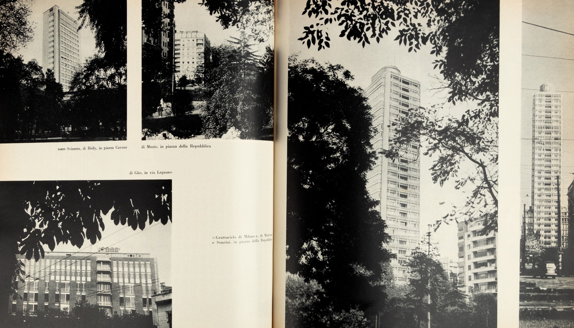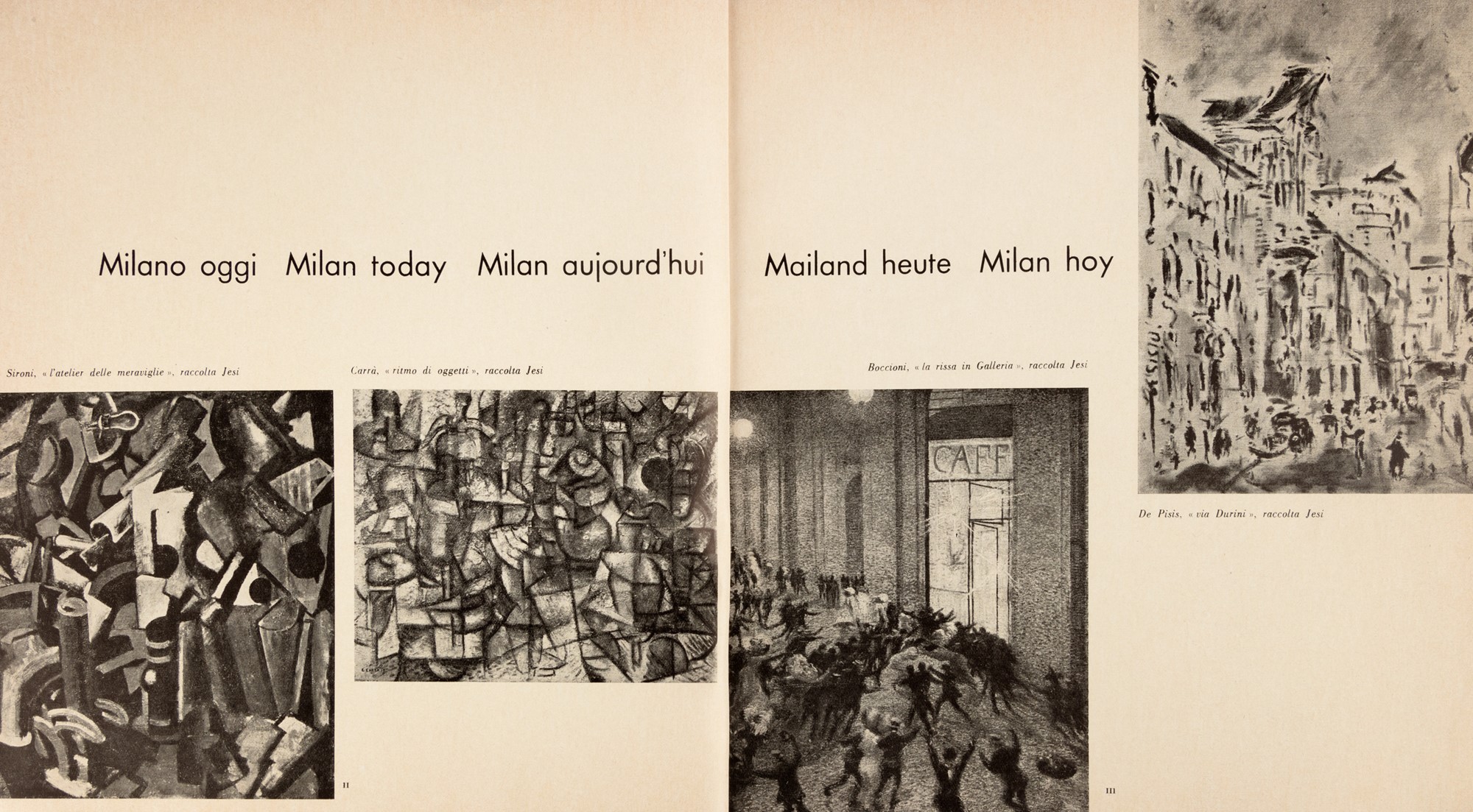 Milano, Edizioni Milano Moderna, [stampa: Istituto Geografico De Agostini - Novara], 1957 (novembre), 22,5x22 cm., brossura, custodia, copertina illustrata con due immagini fotografiche e composizione grafica in bianco e bluette, titoli in bianco; pagine introduttive su carte diversamente colorate, 322 immagini fotografiche in bianco e nero n.t. Testo in italiano, inglese, francese, tedesco e spagnolo. § Ponti, Gio, Milano oggi - Milan today - Milan aujourd'hui - Mailand heute - Milan hoy [3a edizione], Milano, Milano Moderna, [stampa: Stabilimento Grafico R. Scotti - Milano], 1959 (novembre), 22,5x21 cm., brossura, dorso in tela, custodia, pp. XV (3) - 104 (4), copertina con titolo in bianco su fondo color mattone, pagine introduttive su carte diversamente colorate. Volume interamente illustrato con immagini fotografiche in bianco e nero n.t., una pianta della città stampata in rosso in ultima pagina. Testo in italiano, inglese, francese, tedesco e spagnolo.