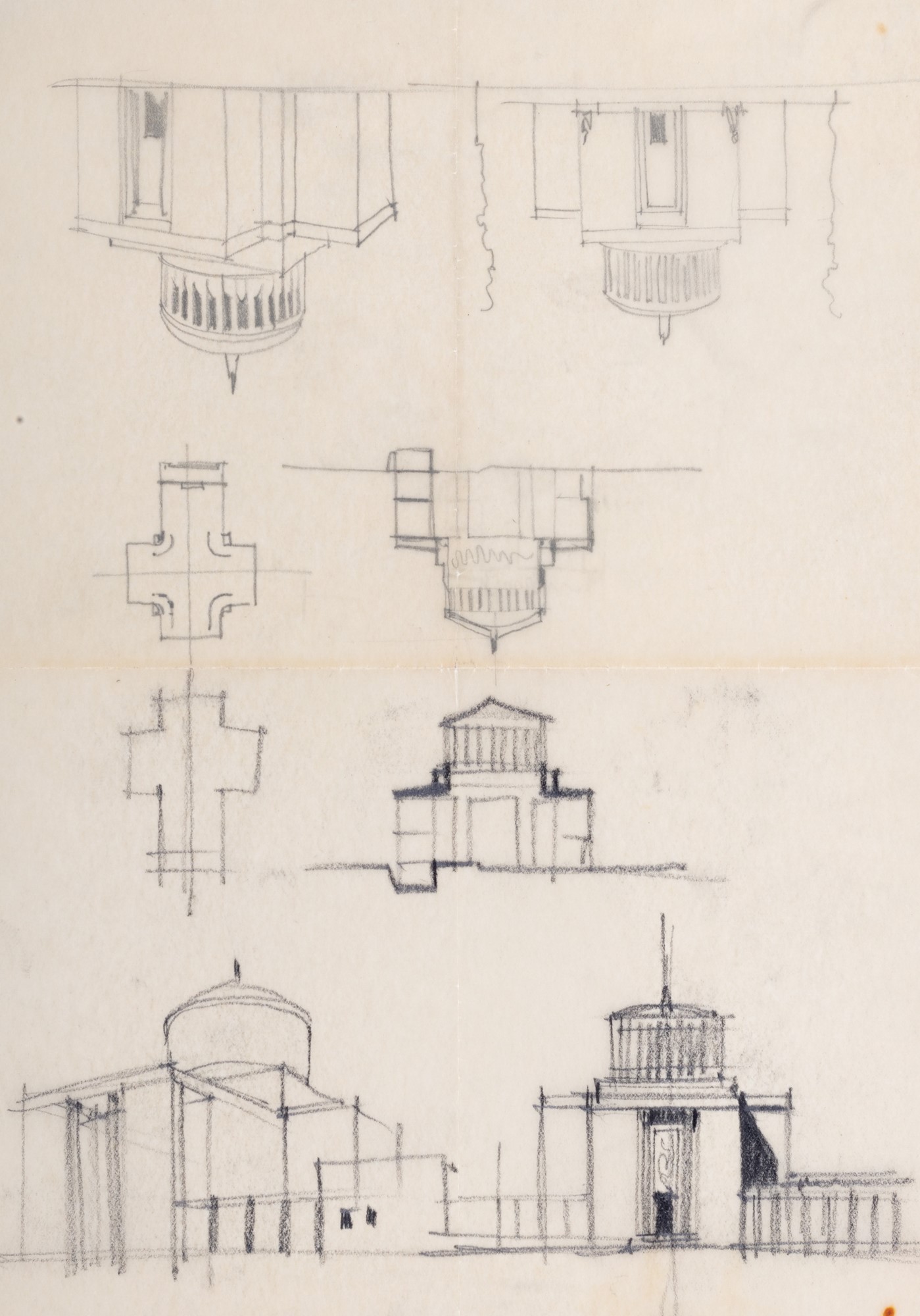 Cinecittà, 1950 ca., 18,5x26 cm., progetto su un foglio in carta pergamenata semi-trasparente con cinque disegni a matita.