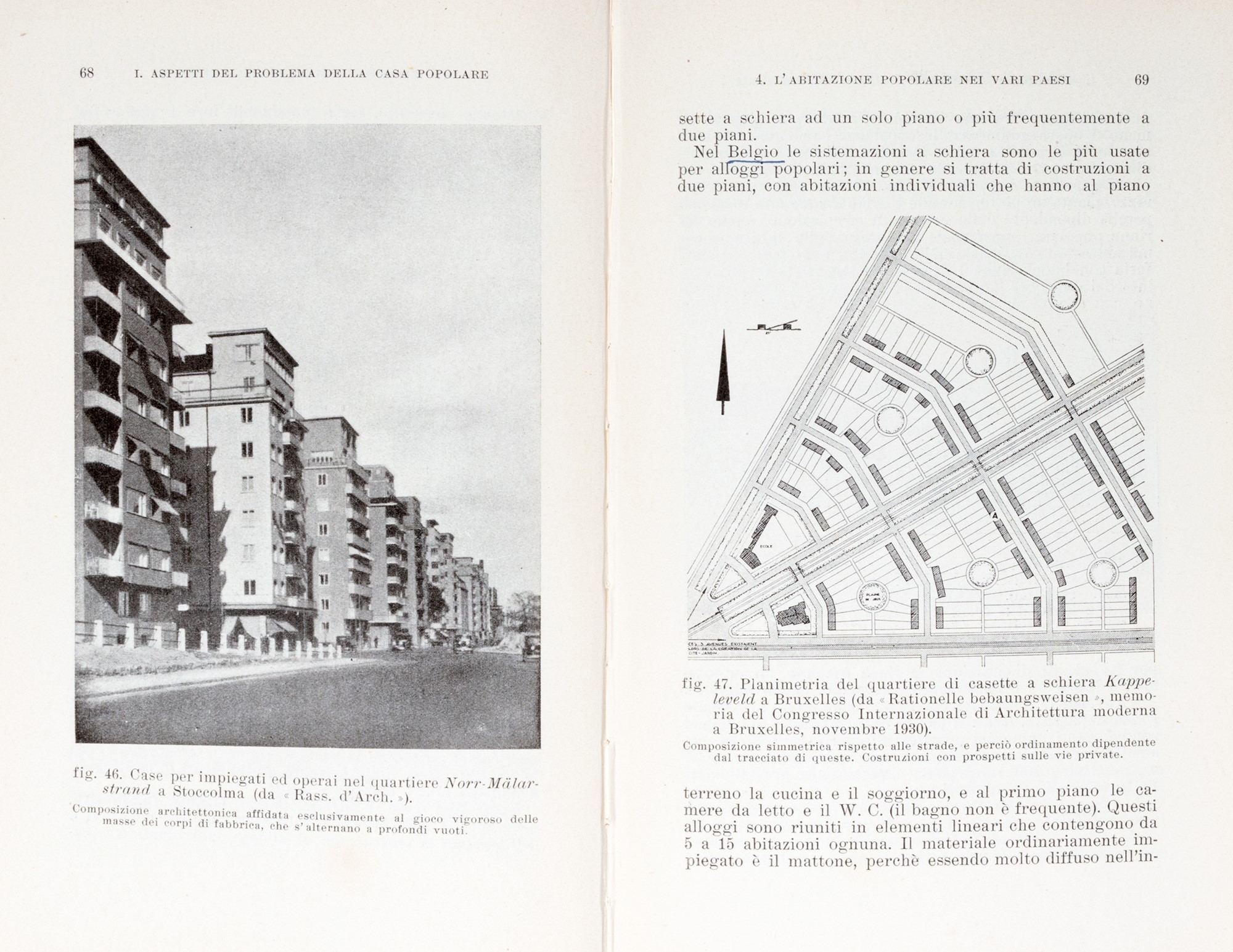 Napoli, E.P.S.A. Editrice Politecnica S. A., 1935, 20,5x13,5 cm., brossura editoriale con titolo stampato in nero al piatto e al dorso, sovraccopertina, 150 figure n.t. con riproduzioni di piante e prospetti fotografici di edifici popolari progettati dagli architetti Griffini, Albini, Ehn, Delaage, Pacon, Taut, Mebes, Emmerich, Oud e altri. Allegata una lettera dattiloscritta su carta intestata «Giuseppe Samonà - Architetto», con firma autografa, indirizzata a Paolo Antonio Chessa (Milano 1922 - Pescara 1981) e datata 1954 (20 novembre), 14,6x20,7 cm.