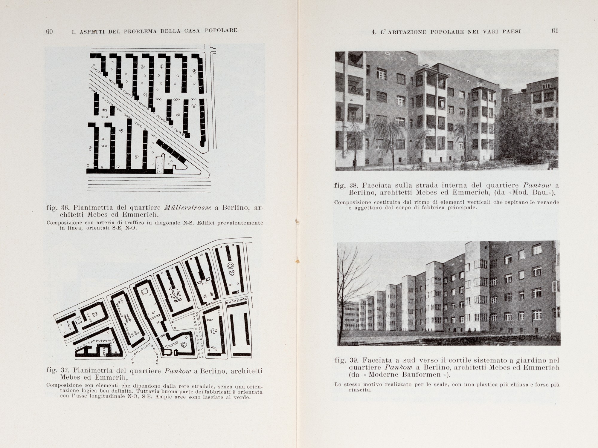 Napoli, E.P.S.A. Editrice Politecnica S. A., 1935, 20,5x13,5 cm., legatura editoriale in tela con titolo in oro sul dorso, sovraccopertina, pp. VIII-206-(2), 150 figure n.t. con rirpoduzioni di piante e prospetti fotografici di edifici popolari progettati dagli architetti Griffini, Albini, Ehn, Delaage, Pacon, Taut, Mebes, Emmerich, Oud e altri.