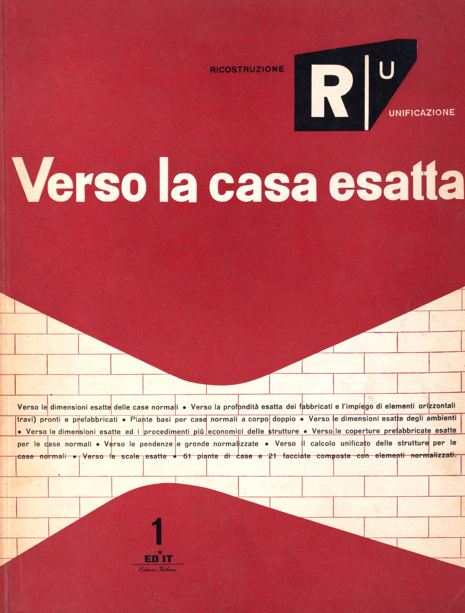 (Tutto il pubblicato - All published), Milano, ED*IT Editrice italiana, "Ricostruzione / Unificazione", [stampa: Stab. Arti Grafiche Alfieri e Lacroix - Milano], 1945 (30 settembre), 32,1x24 cm., brossura, pp. 63 (1), copertina illustrata con una composizione grafica in marron, bianco e nero. Opuscolo interamente illustrato con piante, disegni e progetti in bianco e nero e fondino verde degli architetti: Pietro Giulio Bosisio, Adalberto Libera, Gio Ponti, Pierangelo Pozzi, Eugenio Soncini, Giuseppe Vaccaro, Carlo Villa, Guido Beretta. Design e impaginazione di autore anonimo (Albe Steiner?).