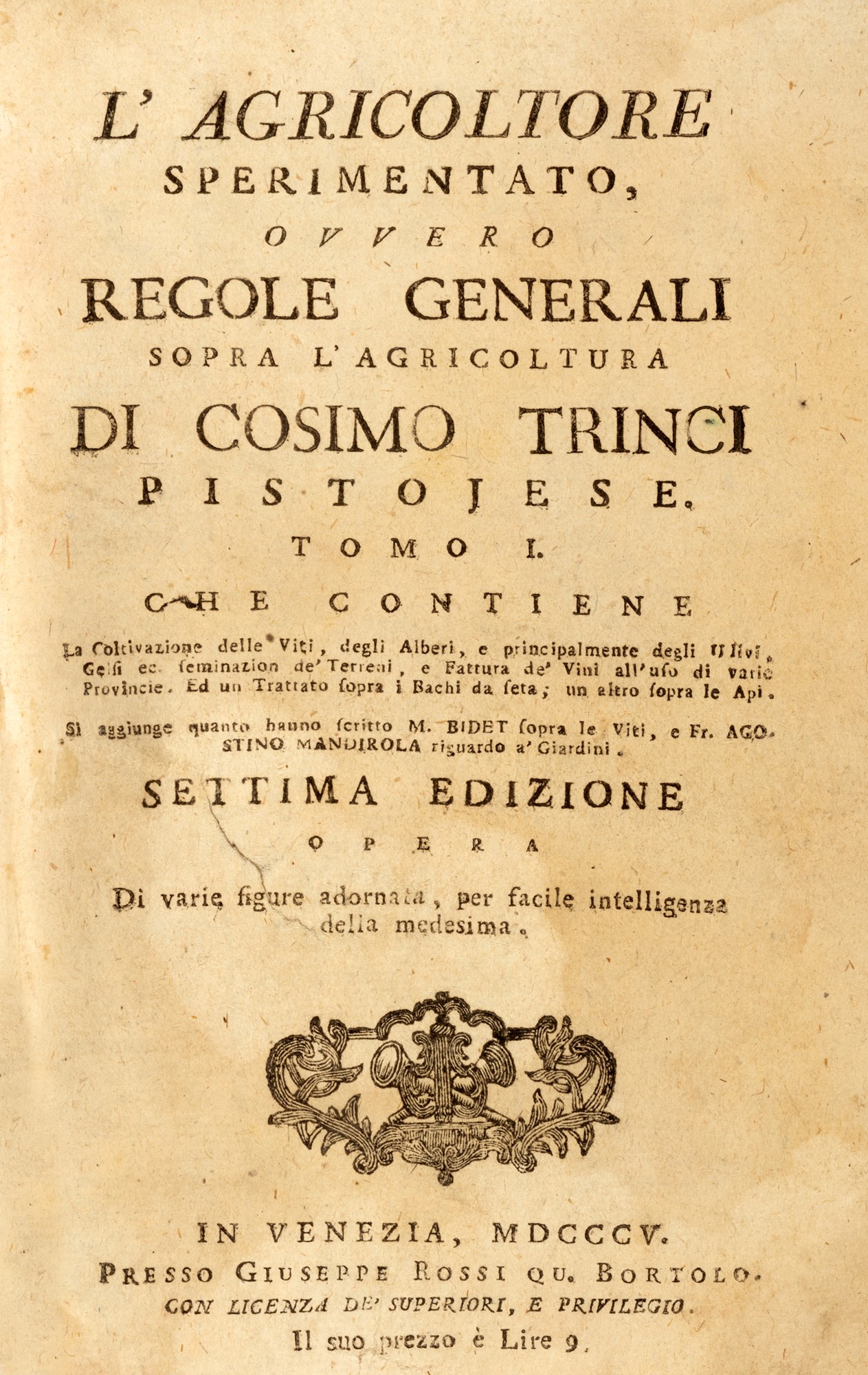 I opera: uno tra i più importanti manuali pubblicati in Italia. La prima edizione del 1731 andò ampliandosi nel corso del tempo fino a questa settima edizione che raccoglie la maggior parte delle voci più autorevoli sull'agricoltura nel sec. XVIII.