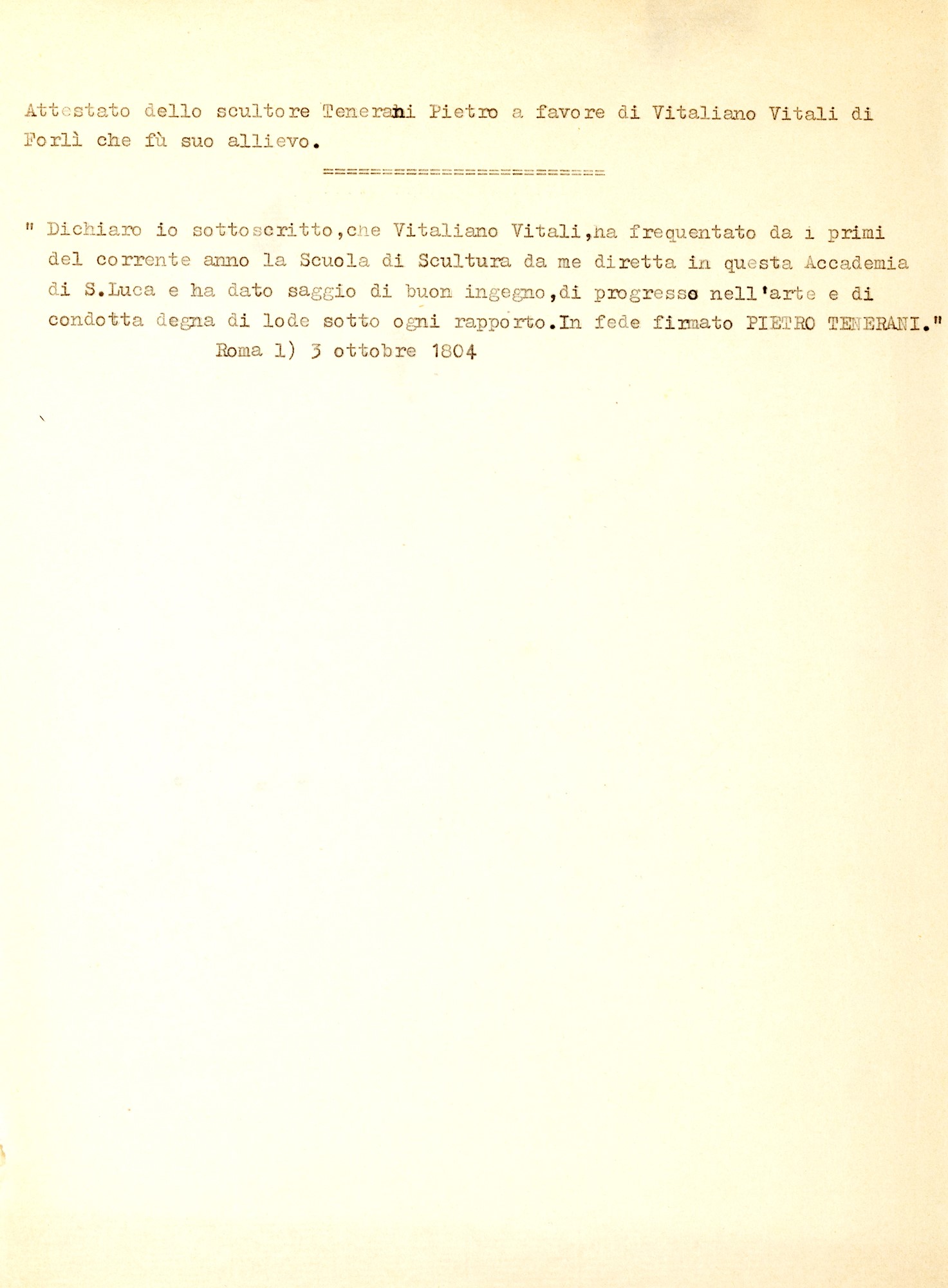 Lunga supplica ad un sig. ‘Conte’ datata 15 ottobre 1854, con in calce una dichiarazione di Pietro Tenerani, celebre scultore carrarese (1789 – Roma 1869), allievo del celebre scultore danese Bertel Thorvaldsen, attestato di “buon ingegno e progresso nell’arte” a favore del suo allievo (all’accademia di S. Luca) Vitali Vitaliano. dopo una prima formazione avvenuta nella città natale, si trasferì a Firenze dove ebbe modo di perfezionarsi sia in pittura sia in scultura. Fervente patriota, nel 1854 fu imprigionato per attività sovversive. In modi che richiamano gli esempi del Purismo toscano si dedicò prevalentemente al genere del ritratto (Ritratto di Giovanni Papa, 1853-1856, Bologna, Museo Civico del Risorgimento). Testo principale su 35 righe (quello di Tenerani su 5 righe in basso a sin.), formato lettera Mm 275 x 195 mm. Si aggiungono : 2 lettere dell’architetto e storico dell’arte Luca Beltrami (1854-1933) e una cartolina dello psichiatra ed entomologo svizzero Auguste Henri Forel (1848 –1931).