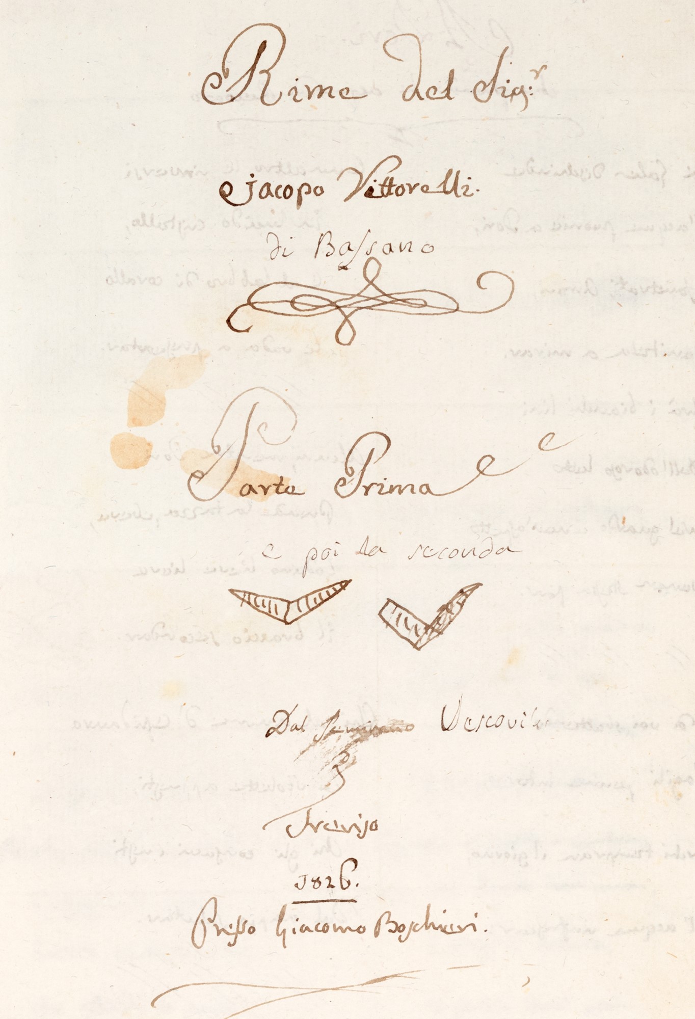 Treviso, 1826, In 8°, cartone rustico orig., cc. 75 nn.(2 parti in un vol.) Manoscritto contenente le ‘Rime edite ed inedite’ di Jacopo Andrea Vittorelli, pubblicate con questo titolo a Padova tra il 1825 e 1826. Nato a Bassano nel 1750, il Vittorelli, poeta arcadico, aveva dato alle stampe già sul finire del Settecento alcune raccolte di poesie e di componimenti d’occasione, che qui compaiono tra le ‘edite’; a queste si aggiungono altre canzoni, poemetti e sonetti secondo l’edizione riportata nel secondo frontespizio (Treviso, Dal Seminario vescovile, Presso Giacomo Boschieri), che tuttavia non risulta in ISBN.