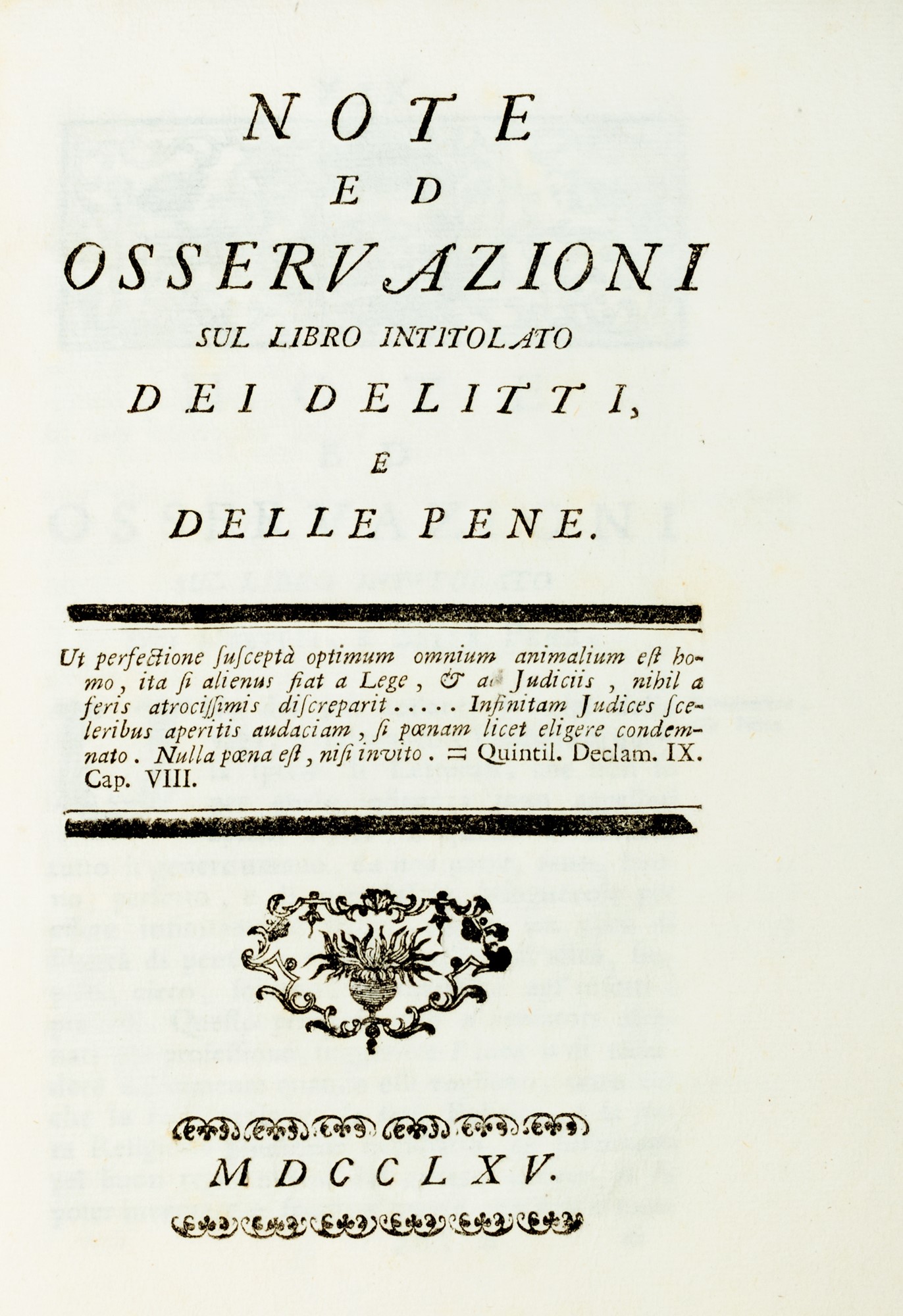 Milano, Giovanni Silvestri, 1809. In 8°. Esemplare in barbe, lievi fioriture marginali, legatura di epoca successiva in mezza pergamena, autore e titolo impressi in oro entro tassello al dorso. § Facchinei, Ferdinando, Note ed osservazioni sul libro intitolato Dei delitti, e delle pene, [Venezia, Antonio Zatta], 1764. In 8°. Esemplare in barbe, fregi xilografici, legatura coeva in carta decorata, titolo manoscritto al dorso. § Beccaria, Cesare; Massa, Ruffino, Dei delitti, e delle pene opera del sig. marchese Beccaria di Milano, ridotta a miglior ordine, e corredata di note critiche, Monaco [i.e. Nizza], Società Tipografica, [1783]-1784. In 12°. 2 voll. di cui il secondo intitolato Risposta ad uno scritto che s'intitola: note ed osservazioni sul libro dei delitti, e delle pene, in barbe, qualche leggera macchia e fioritura, legatura di epoca successiva in cartoncino rigido marmorizzato, autore e titolo impressi in oro al dorso.