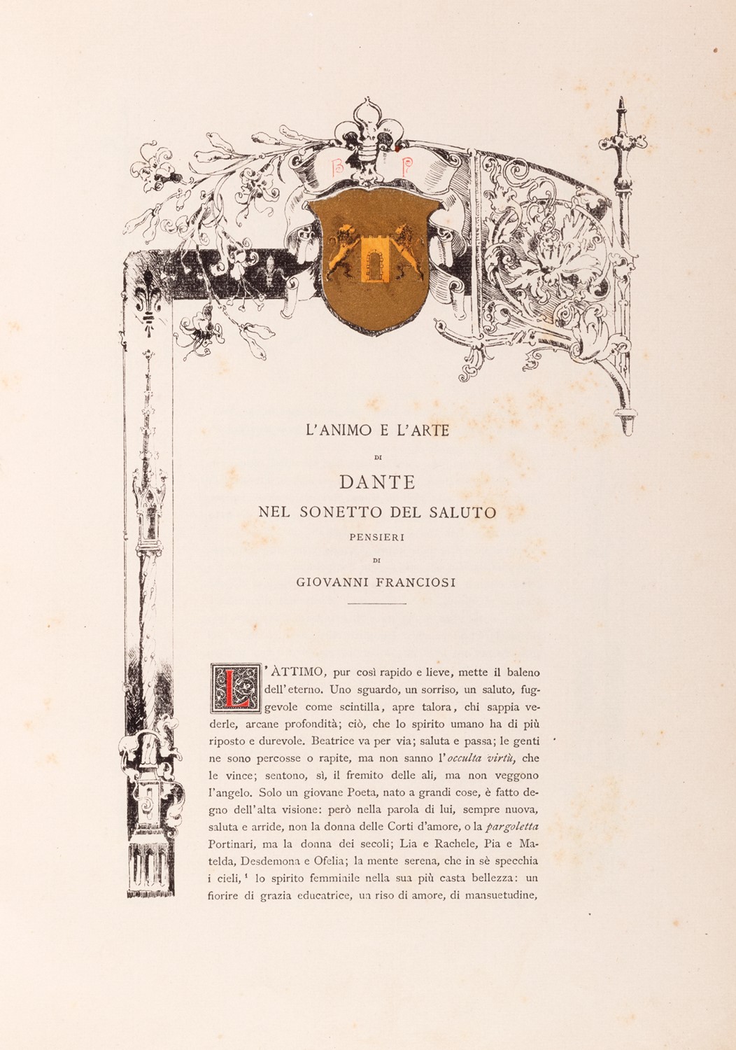 Rovigo, Officina Minelliana, 1890. In 2°, 370 x 250 mm. Elegante carattere tipografico antico per l’introduttivo sonetto del Saluto dalla Vita Nuova XXVI, testo stampato entro cornice finemente decorata da motivi araldici, esemplare n.250 su 300, legatura editoriale in cartone ricoperto da velina decorata, strappi e mancanze. Firma e dedica al foglio di guardia di Martini, datata Roma 28 giugno ‘95.