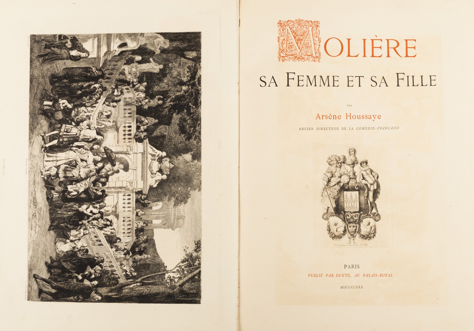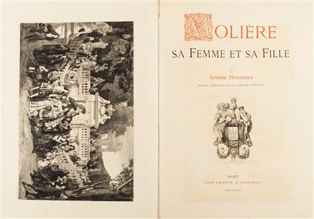 Parigi, Dentu, 1880. In 2°. Frontespizio in rosso e nero con elegante vignetta incisa in rame, ritratto di Molière, della moglie e della figlia, con 36 tavole, la maggior parte protette da velina, numerose testatine e cul-de-lamp finemente illustrati, capilettera decorati, qualche fioritura e lieve alone, legatura in mezza pergamena e carta decorata, lievi difetti.