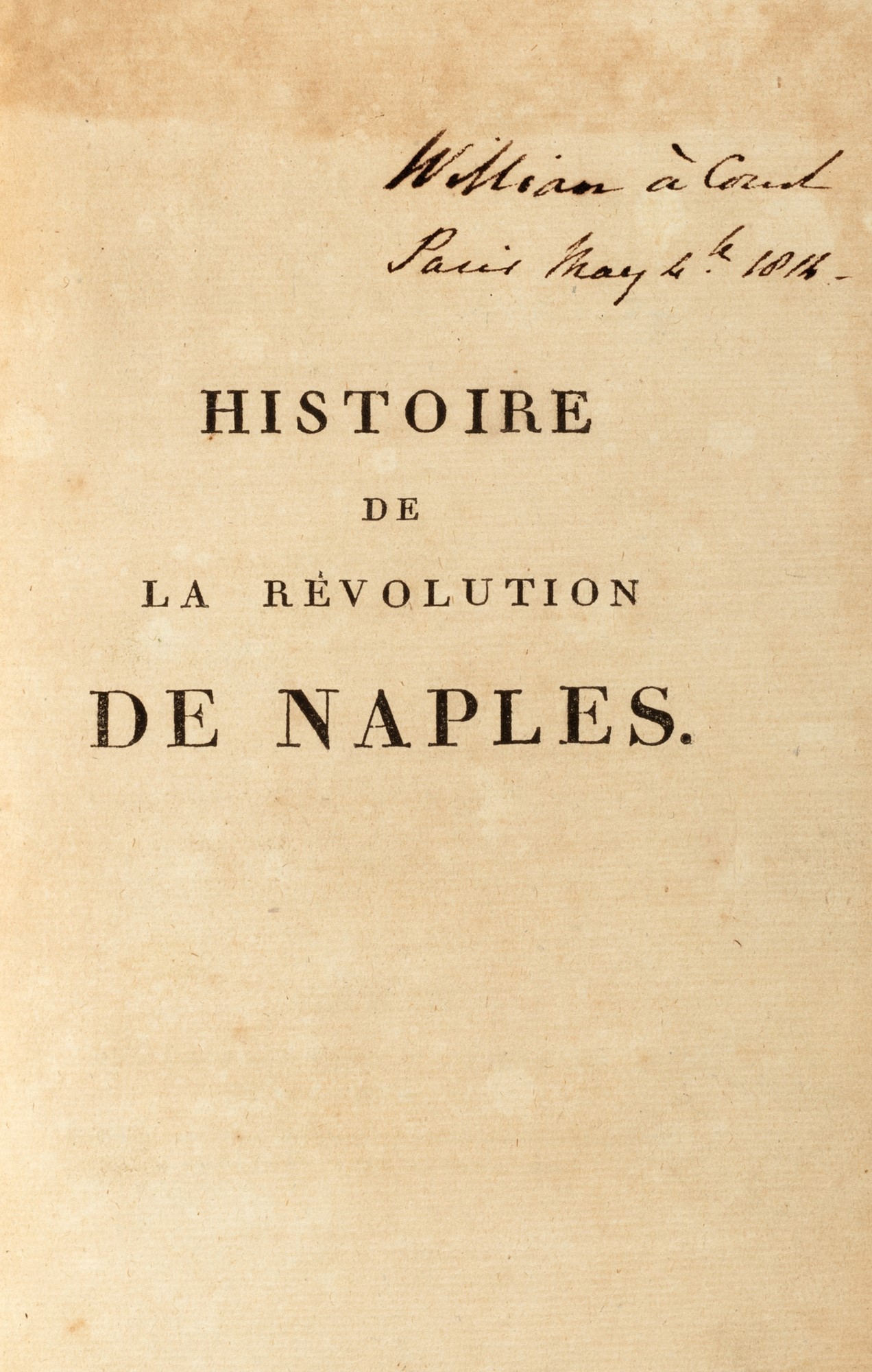 Milano, Sonzogno, 1806. In 8°. Esemplare in barbe, leggero alone di umidità al margine superiore delle prime carte, lievi fioriture marginali, legatura in carta decorata, qualche lacuna al dorso, difetti. § Cuoco, Vincenzo, Histoire de la Révolution de Naples, Parigi, Léopold Collin, 1807. In 8°. Occhietto, qualche carta con lievissima brunitura, sporadiche piccole macchie e fioriture, legatura coeva in piena pelle, dorso liscio con fregi, piatti restaurati. Ex libris cartaceo al contropiatto, dedica manoscritta all'occhietto.