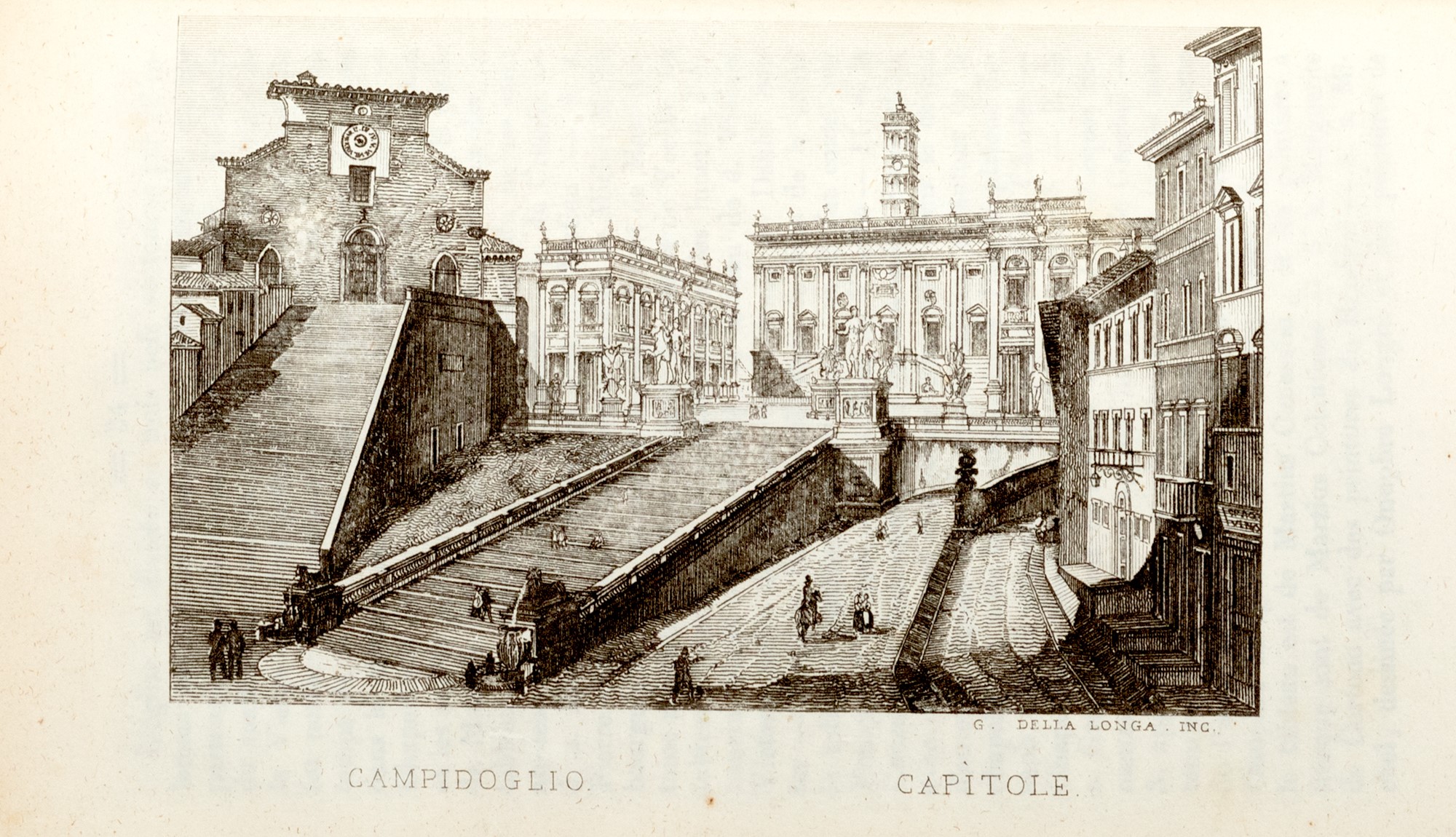 Roma, E. Loescher, 1886. Con 5 carte di tavole di cui una grande carta geografica di Roma ripiegata, tavole leggermente brunite, rarissime fioriture, legatura in mezzo chagrin rosso, titolo e autore impressi in oro al dorso, lievi difetti. § Rufini, Alessandro, Guide de Rome et de ses environs orné de palches et de la carte topographique de la ville, Roma, Imprimeria Forense, 1861. In 12°. Con diverse tavole calcografiche fuori testo, mancante la carta ripiegata, rare e lievi fioriture e arrossature, legatura coeva in mezza pelle, autore e titolo in oro al dorso liscio, tagli rossi, lievissimi segni di usura al dorso.