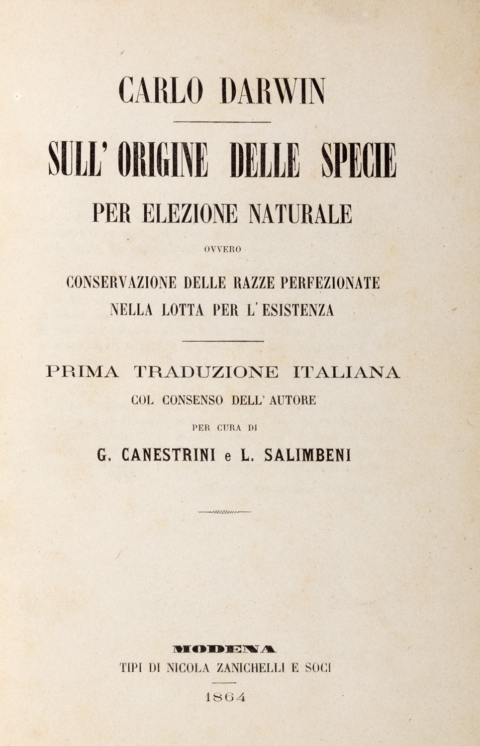 Rara prima traduzione italiana a cura di G. Canestrini e L. Salimbeni dell’opera di Darwin pubblicata in Inghilterra nel 1859. Esemplare completo della tavola litografica e dei piatti della brossura originale.