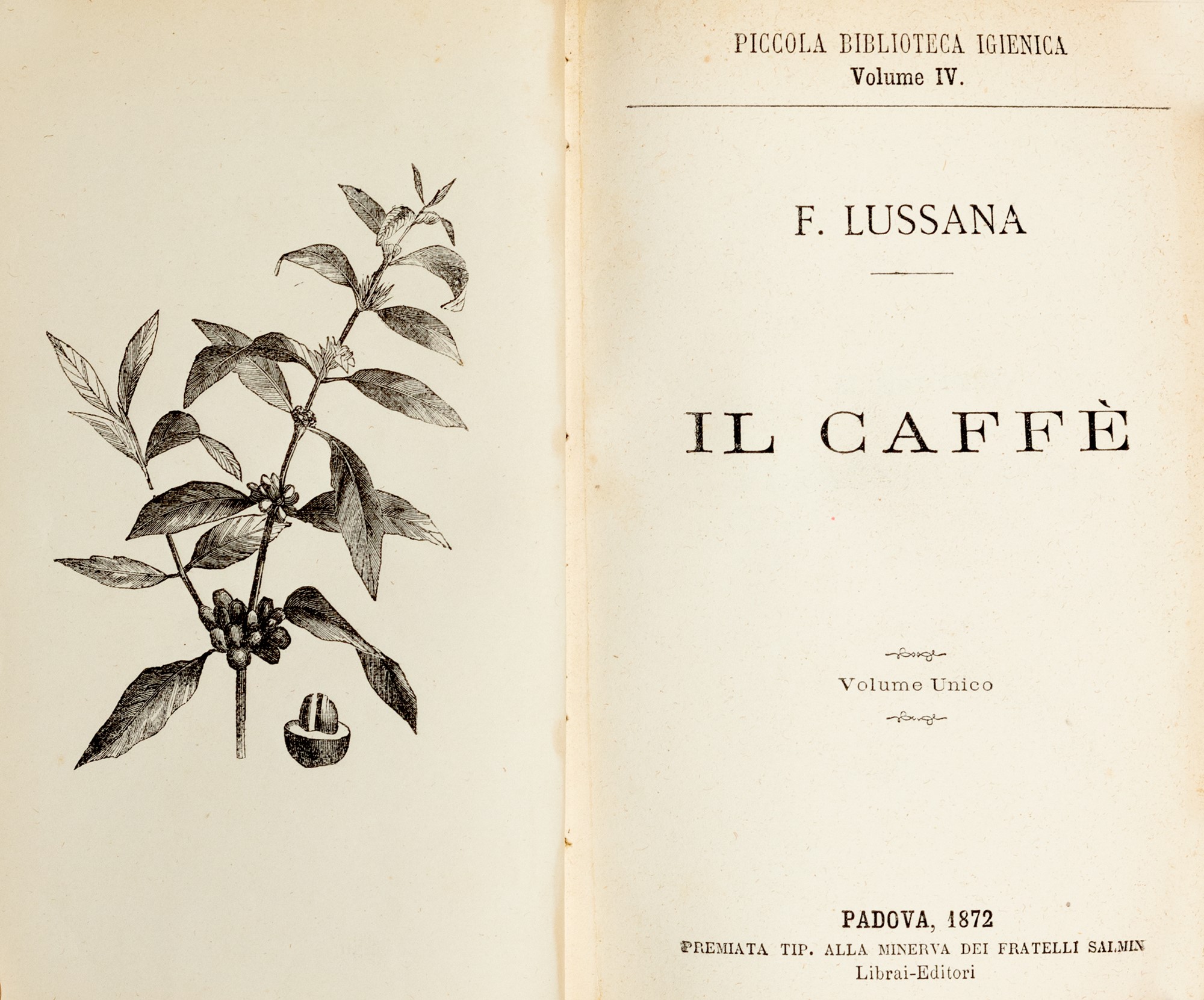 Rara e interessante miscellanea di prime edizioni dedicata alla storia del caffè e dei suoi effetti sull'uomo tra cui il testo Il Caffè di Filippo Lussana. L'autore (1820-1897), fisiologo specializzato in ricerche sull'alimentazione, traccia la storia del caffè, i luoghi della produzione, le modalità di preparazione e si sofferma tra l'altro sul consumo in Europa e negli Stati Uniti di tale bevanda utilizzando dati statistici.