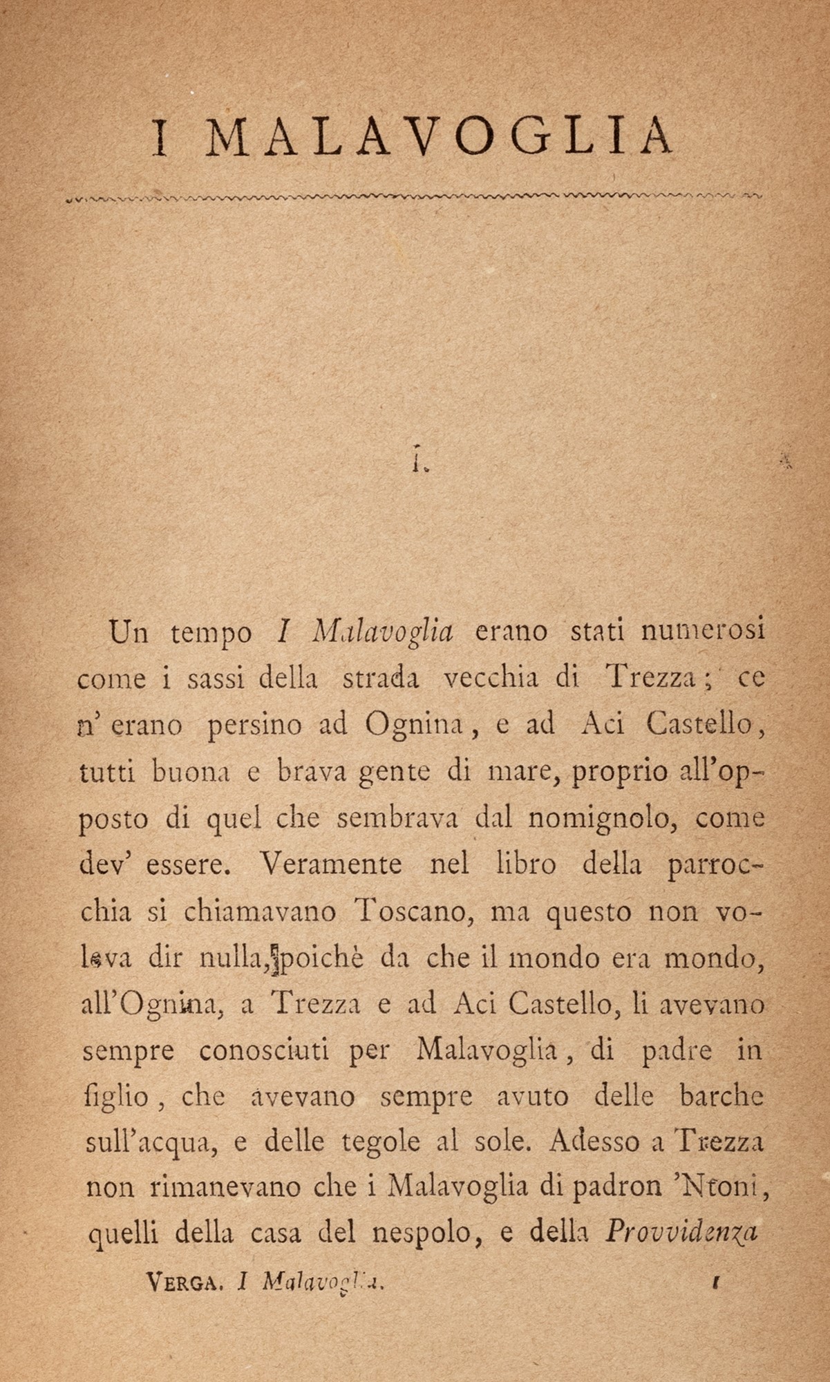 Prima edizione, rarissima del capolavoro del verismo italiano, il romanzo in cui la poetica del verismo viene espressa al meglio e le tecniche narrative sperimentate precedentemente vengono perfezionate. Rappresenta la prima tappa del ciclo dei vinti quei “vinti che levano le braccia disperate, e piegano il capo sotto il piede brutale dei sopravvegnenti". Giovanni Verga (Vizzini 1840 – Catania 1922) trascorre l’infanzia e la prima giovinezza in Sicilia. Di famiglia nobile, liberale e antiborbonica, si dedica ben presto alla letteratura. A Firenze prima e Milano poi, viene a contatto con l’ambiente letterario europeo più vivo del tempo maturando le idee nuove che approderanno alla poetica del verismo e rinnoveranno profondamente la narrativa italiana. In pochi anni scrive quasi tutti i suoi capolavori nei quali domina il paesaggio siciliano non lirico ma specchio di desolazione, sofferenza umana, lotta quotidiana per il pane, mortificante lavoro ma anche unico e costante conforto affettivo.