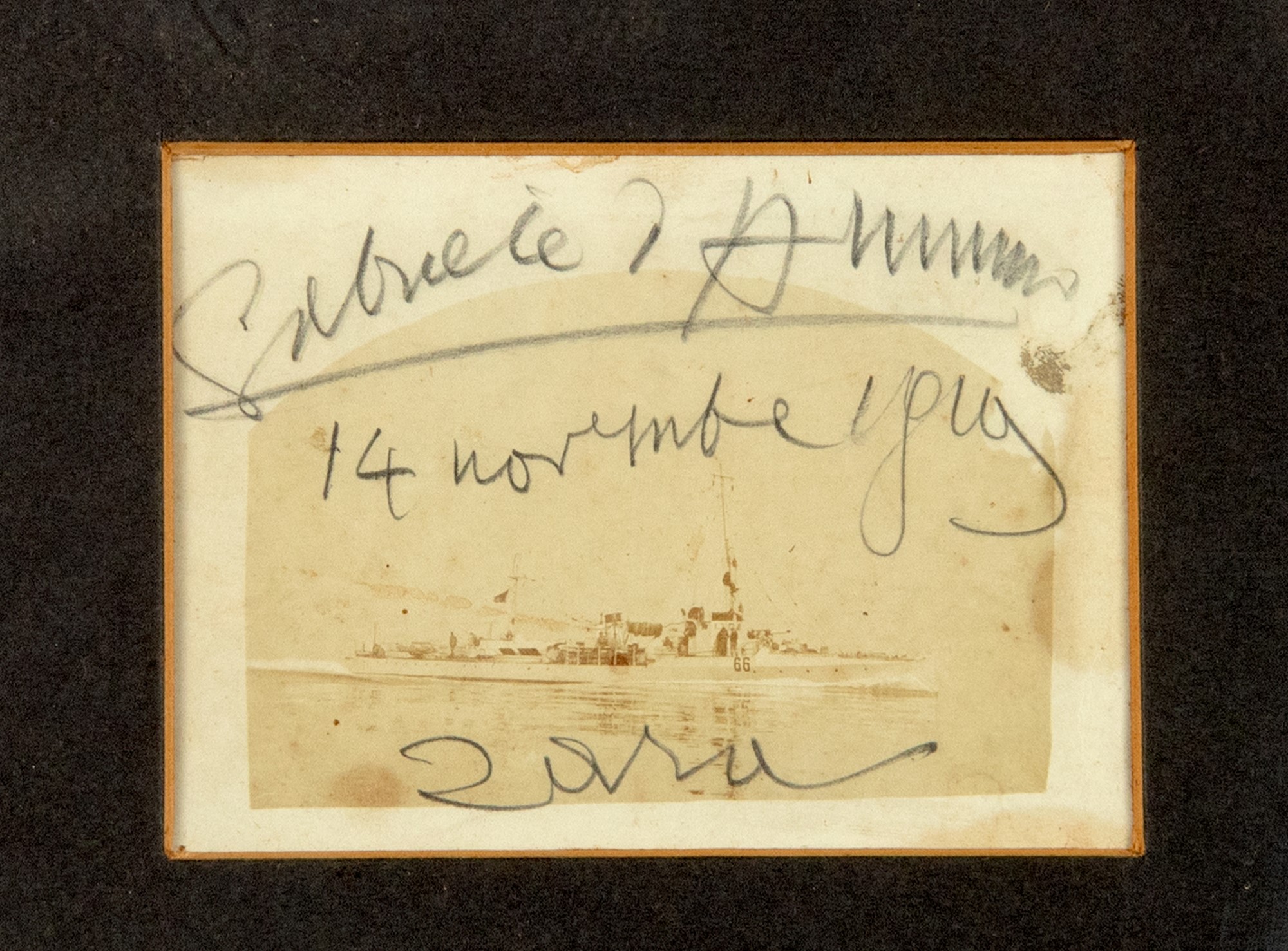 Bella foto dell'incrociatore Zara, 97 x 65 mm., con firma di Gabriele d'Annunzio e data 14 novembre 1919, in cornice verde; insieme il raro facsimile del Carmen Votivum, Mondadori, 1931, impresso in appena 200 esemplari.