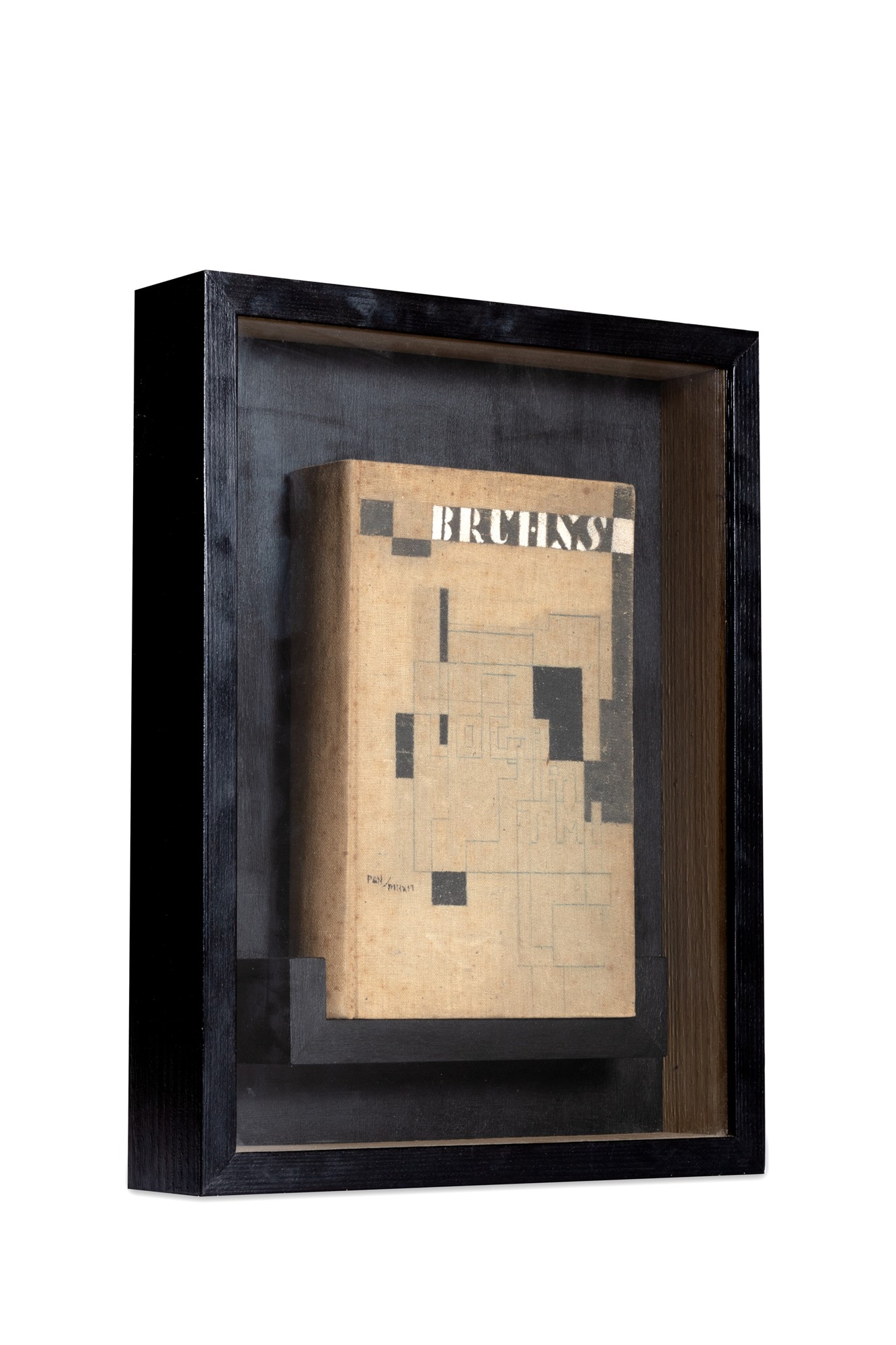 Legatura in canapa con disegno di genere astratto per "Bruhns", Nuovo manuale logaritmo -trigonometrico, Lipsia 1920. Appartenuto a Vinicio Paladini. Presente con il n.456, p.456 del catalogo dell'Arengario , Vinicio Paladini, futurista - immaginista [...], 1997.