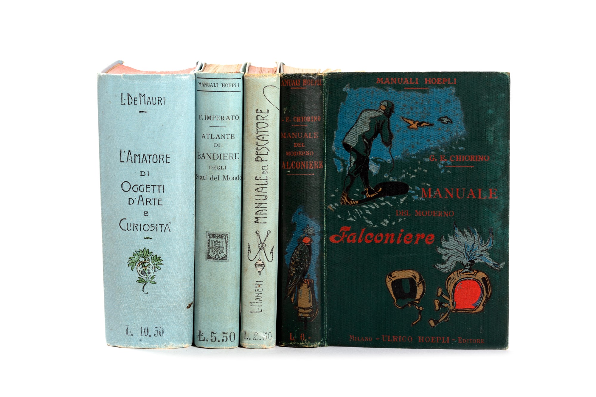 Bell'insieme che comprende 4 Manuali Hoepli tascabili, cm 15 x 10,5, con numerose tavole nel testo, leggera brunitura, qualche sporadica fioritura, ciascuno con brossura editoriale illustrata in cartoncino rigido con lievissimi segni di usura: Imperato, F. Atlante di bandiere insegne distintivi dei principali stati del mondo, Milano, Hoepli, 1914. Prima edizione. Con 50 tavole e 19 figure § Chiorchino, G.E., Manuale del moderno falconiere, Milano, Hoepli, 1906. Prima edizione Con 15 tavole e 80 illustrazioni nel testo, brossura parzialmente staccata dal corpo del libro § Manetti, L. Manuale del pescatore, Milano, Hoepli, 1905. Prima edizione. Con numerose illustrazioni nel testo, brossura parzialmente staccata dal corpo del libro. Firma di appartenenza. § De Mauri, L. [Ernesto Sarasino], L'Amatore di oggetti d'Arte e Curiosità, Milano, Hoepli, 1907. Seconda edizione, con 100 tavole e 270 incisioni.